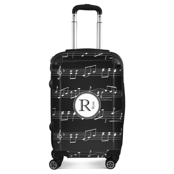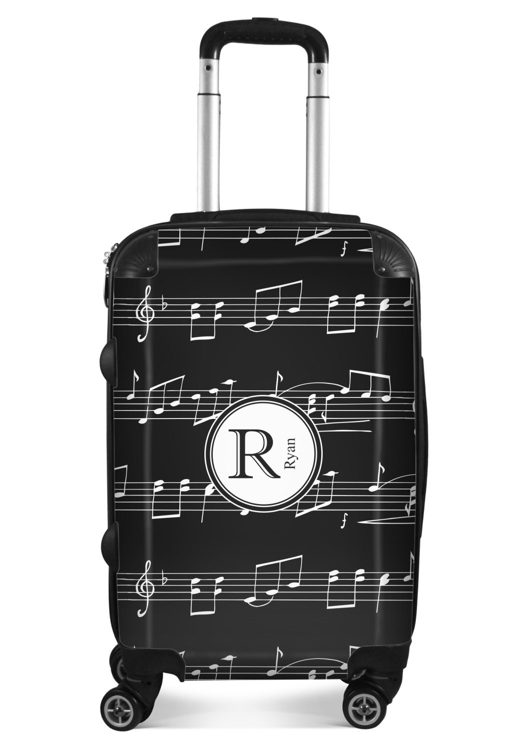 Music notes are set on a white background just like a sheet of music. A simple black outlined white label is placed in the middle of the design. Personalize with an initial and name of your choice.