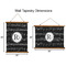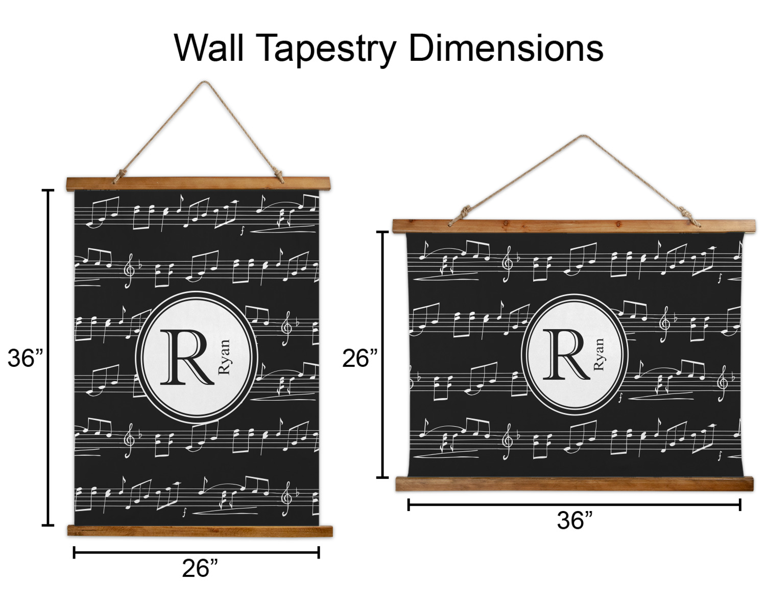 Made in two different orientations - portrait or landscape - both are 26" x 36". Your design is printed on a high quality polyester fabric with hemmed edges. The wood on the top and bottom of the tapestry is 1.25" tall and 0.25" thick and there are two pieces on top and bottom which sandwich the fabric.