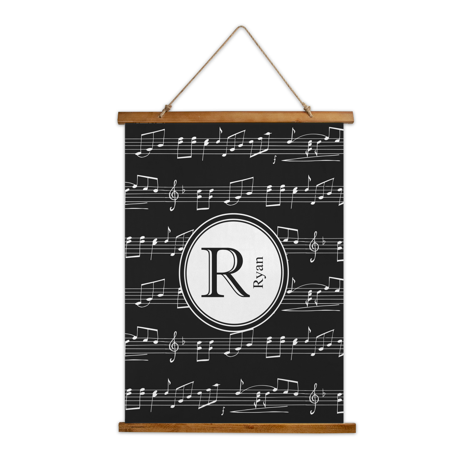 Music notes are set on a white background just like a sheet of music. A simple black outlined white label is placed in the middle of the design. Personalize with an initial and name of your choice.