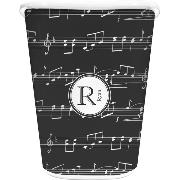 Music notes are set on a white background just like a sheet of music. A simple black outlined white label is placed in the middle of the design. Personalize with an initial and name of your choice.