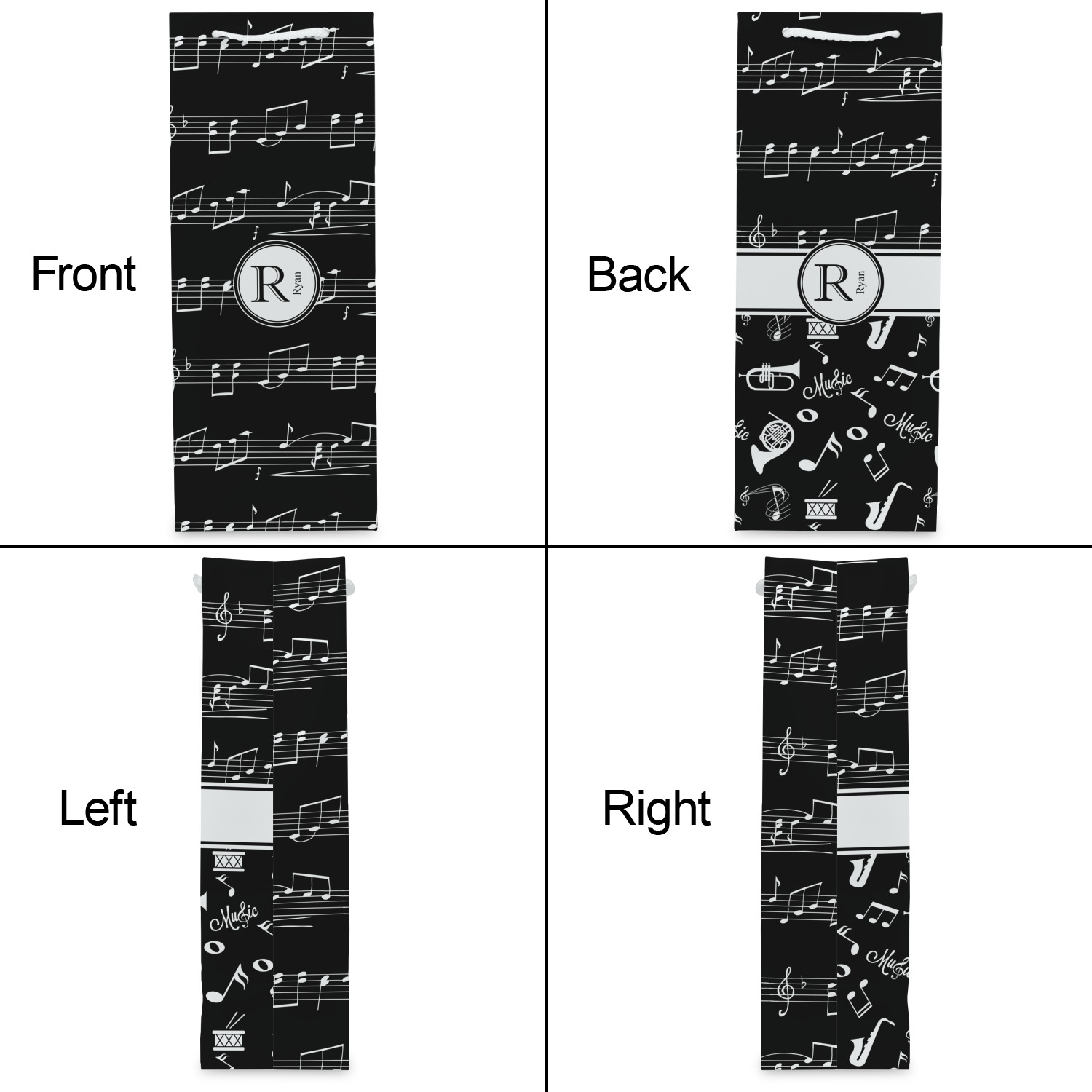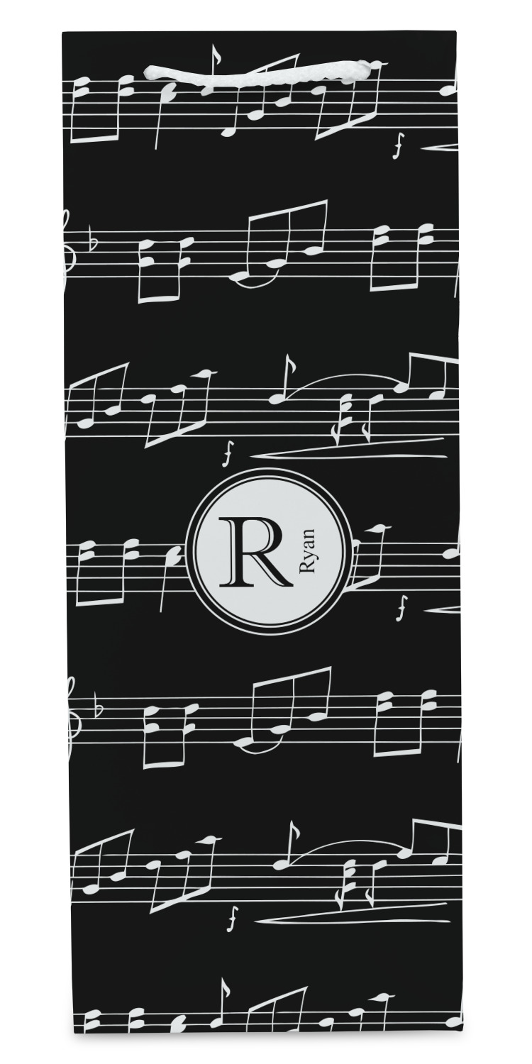 Music notes are set on a white background just like a sheet of music. A simple black outlined white label is placed in the middle of the design. Personalize with an initial and name of your choice.