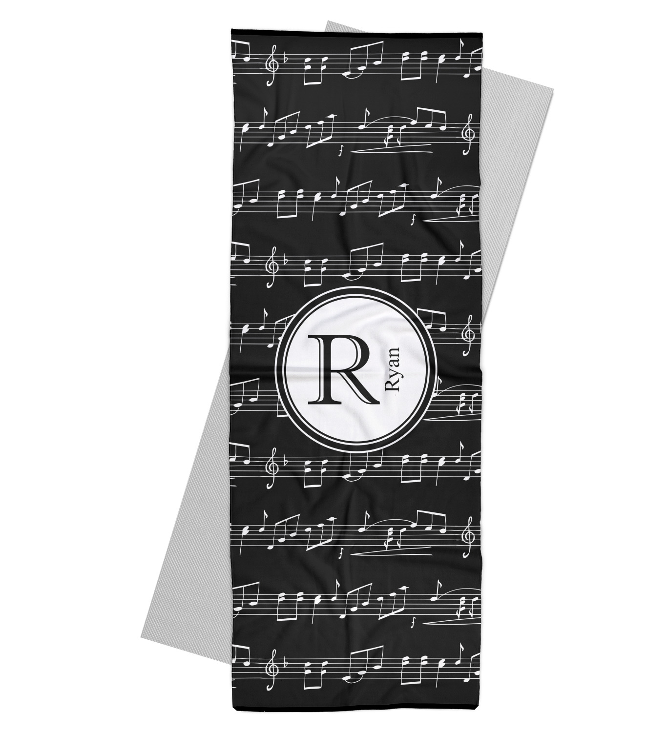 Music notes are set on a white background just like a sheet of music. A simple black outlined white label is placed in the middle of the design. Personalize with an initial and name of your choice.