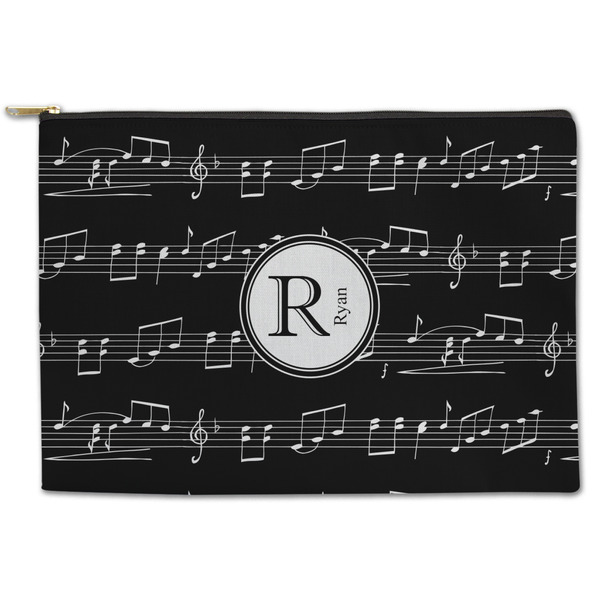 Music notes are set on a white background just like a sheet of music. A simple black outlined white label is placed in the middle of the design. Personalize with an initial and name of your choice.