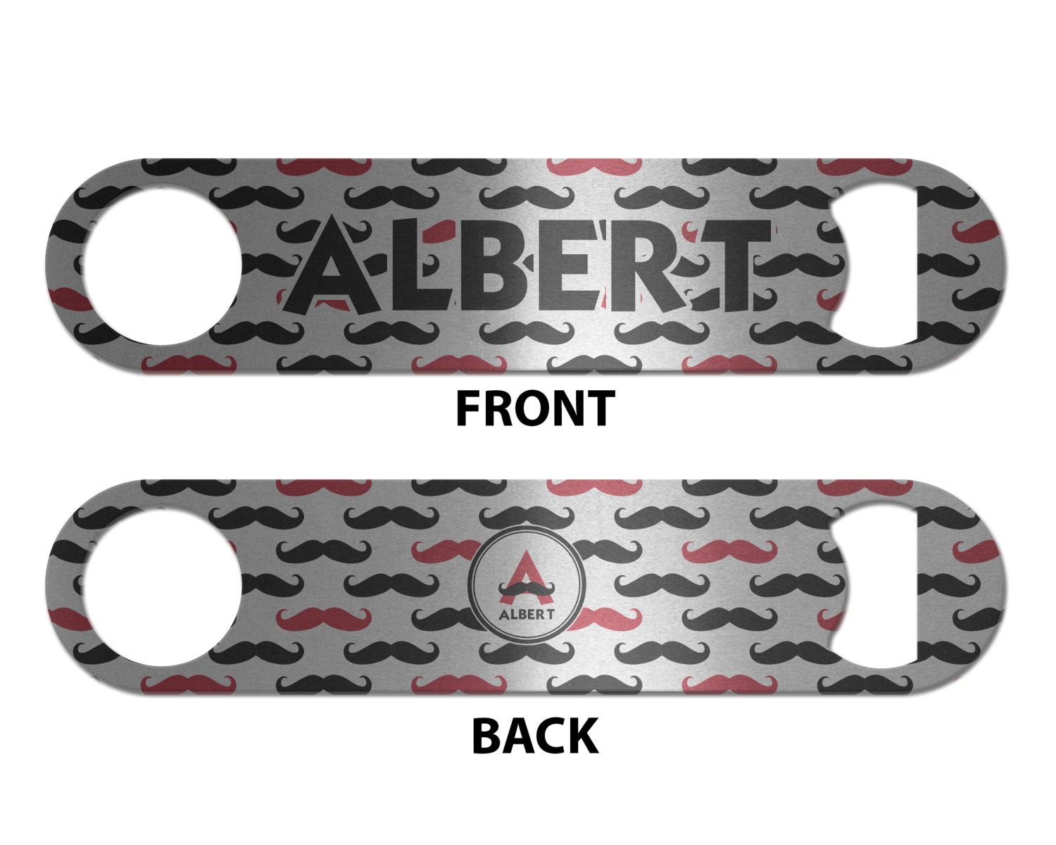 Made from stainless steel, these beer bottle openers are 7 by 1.625 inches, giving you plenty of leverage when trying to open a stubborn bottle. On one end of this personalized bottle opener, you'll find a circular hole for you to hang and display your opener. On the opposite end, you'll find the tool used for opening bottles. This opener in particular has the same structure and style as professional bartender bottle openers. Your customization is sublimated onto both the back and front, and both sides can be customized individually. Choose from one of our two base colors - white or silver.
