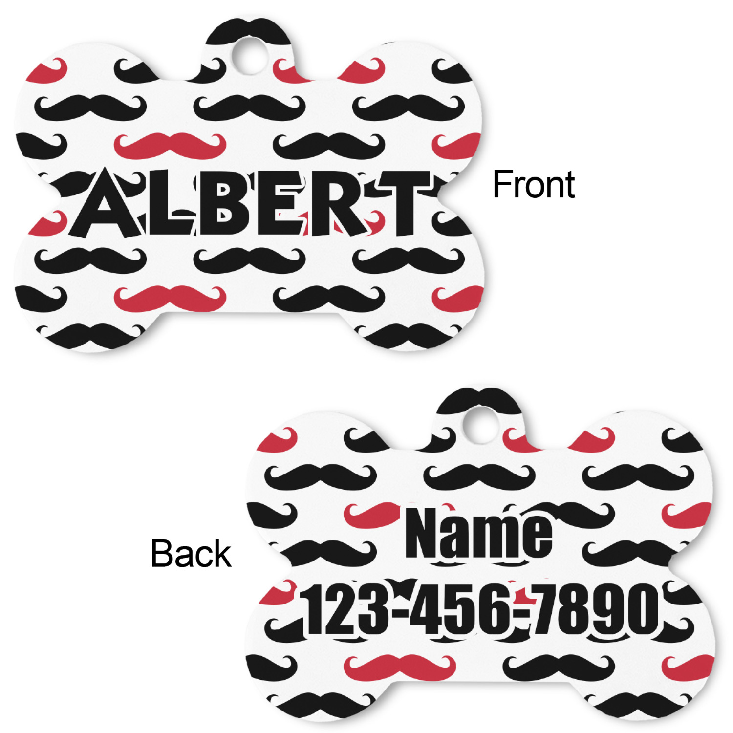 Our default design templates print your dog's personalization on the front and your contact information on the back; however everything is customizable, so you customize the patterns, the colors, the personalization, the contact information etc.