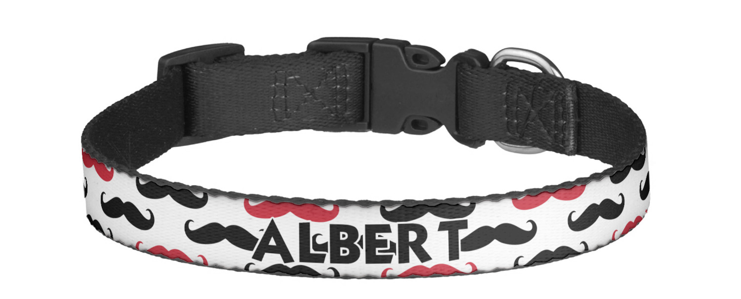 This sturdy collar, made from a durable nylon weave, will outlive your dog's episodes of excited tugging and pulling. Courtesy of its thick plastic buckle and adjuster, this collar is adjustable and accommodating of any dog. Structurally, the collar is a single piece of nylon weave that is sewn together, and features a solid metal loop where you can attach a leash or dog tag. We print and display your dog's name and pattern across the middle of the personalized dog collar.