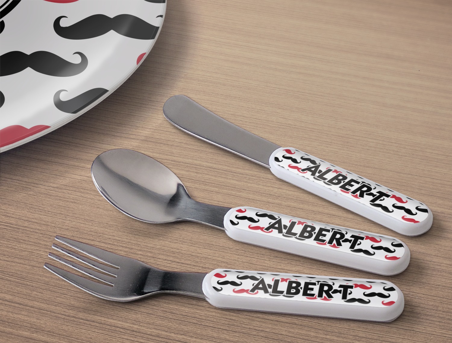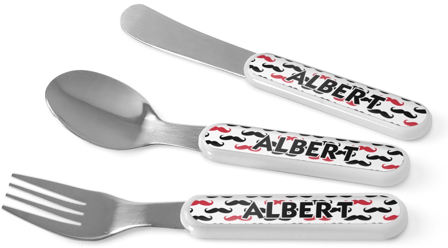 This set of kids' silverware includes a 5.5 inch spoon, fork, and knife, catered to your little one's needs. The prongs of this fork are flat and dull, while our spoon is small enough for tiny mouths, and the dullness of the knife itself resembles a butter knife, at most. These kids' utensils are made of stainless steel, while the handles are crafted from a durable plastic that will withstand the energy and use of your young one. We print your customization across the handles, making the cutlery set unique to your child only.