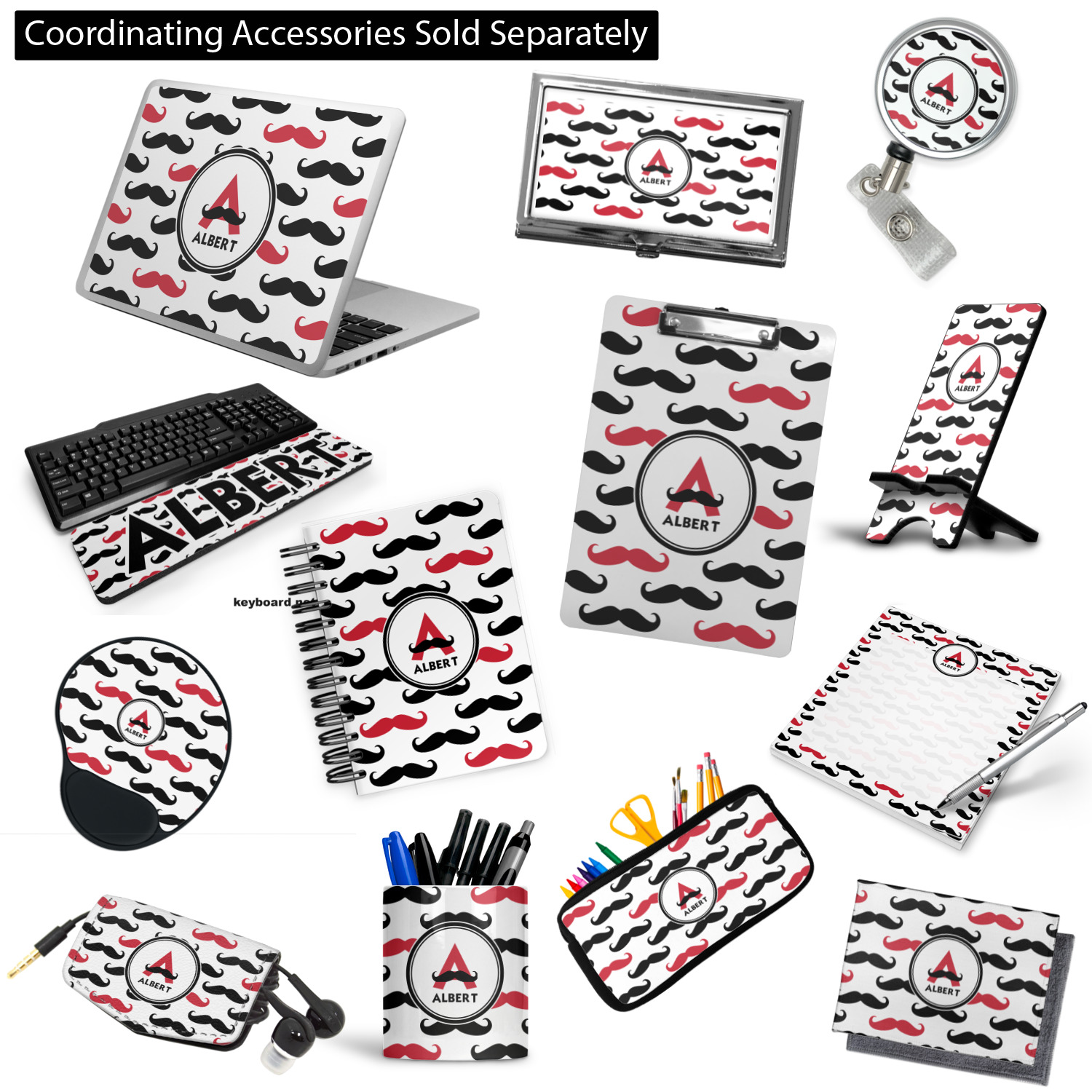 With the growing popularity of mustaches, we had to create a mustache print!! Our adorable mustache print is mostly black and white with a pop of color. We chose to do our design and images with a splash of red. You can customize your design by selecting the color you want! Don't forget to add your name and/or initial for that fun personalization with a touch of whimsy!