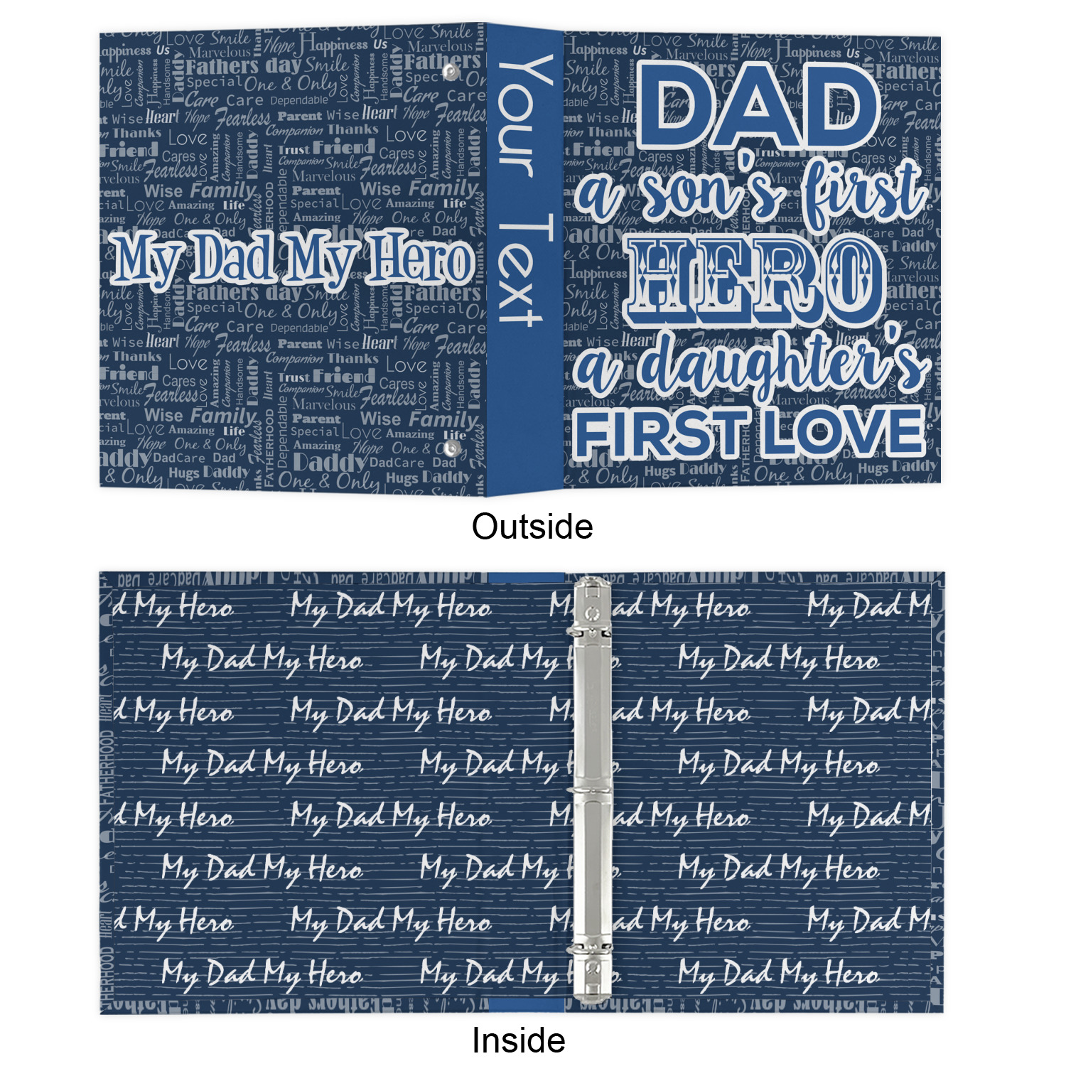 Made from a sturdy cardboard base with a full high quality canvas textured vinyl wrap with the design of your choice. Unlike our standard 3-ring binder with the full wrap design your artwork wraps from the front and back and into the inside of the binder.