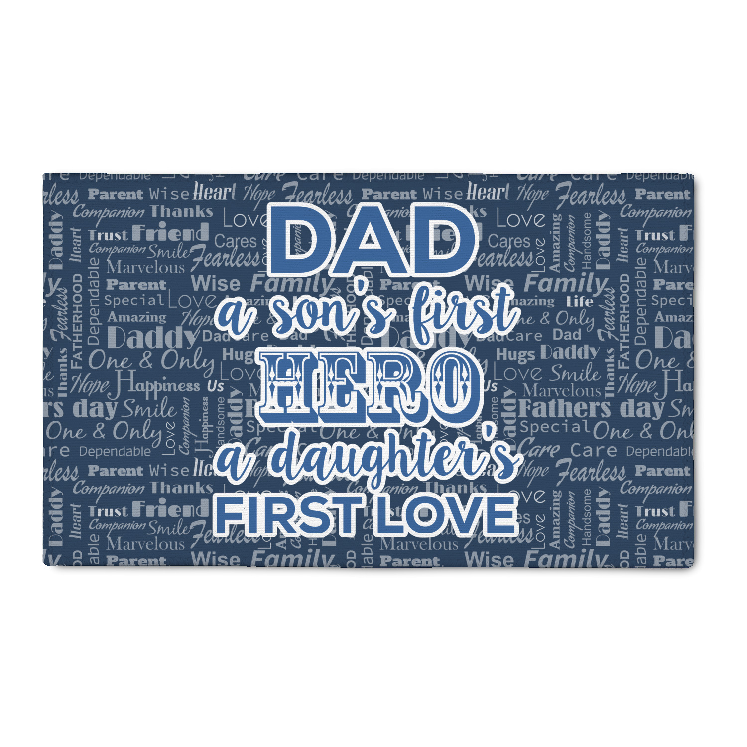 The background of this design is a fun word cloud that says different words to describe a father like "friend," "thanks," "father's day," "happiness," and more. The design is filled with a few different shades of blue and a little accent of white. The main graphic is a quote that says "Dad, a son's first hero, a daughter's first love." What a sweet design for Father's Day!