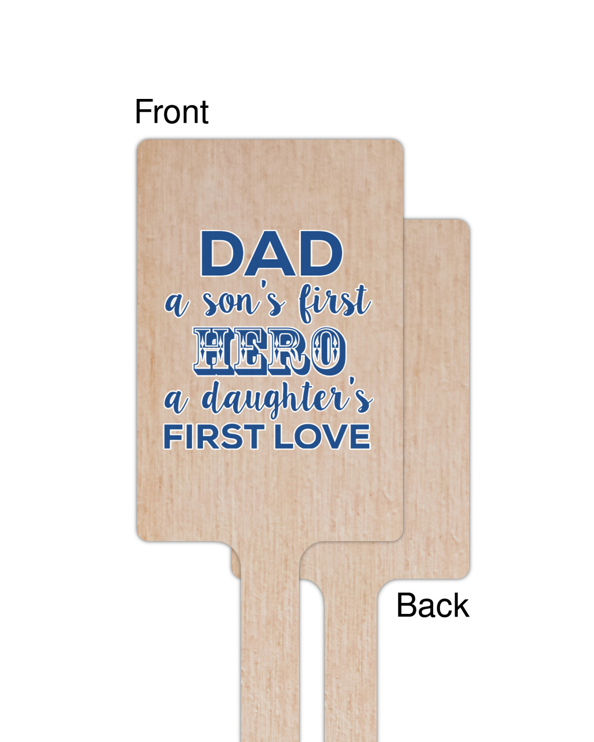 The background of this design is a fun word cloud that says different words to describe a father like "friend," "thanks," "father's day," "happiness," and more. The design is filled with a few different shades of blue and a little accent of white. The main graphic is a quote that says "Dad, a son's first hero, a daughter's first love." What a sweet design for Father's Day!