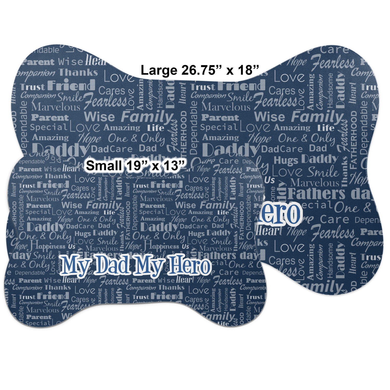 The top of this mat displays your custom design, as it is printed on polyester. To prevent slippage, the underside of the mat is made of rubber. We offer a small dog food mat, suitable for smaller dogs and a large dog food mat for bigger breeds. The small dog food mat is approximately 19 by 13 inches, while the large dog feeding mat measures at approximately 26.75 by 18 inches. Both personalized mats are ideally sized to fit two dog bowls.