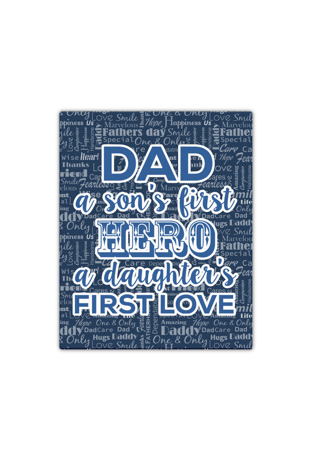 The background of this design is a fun word cloud that says different words to describe a father like "friend," "thanks," "father's day," "happiness," and more. The design is filled with a few different shades of blue and a little accent of white. The main graphic is a quote that says "Dad, a son's first hero, a daughter's first love." What a sweet design for Father's Day!