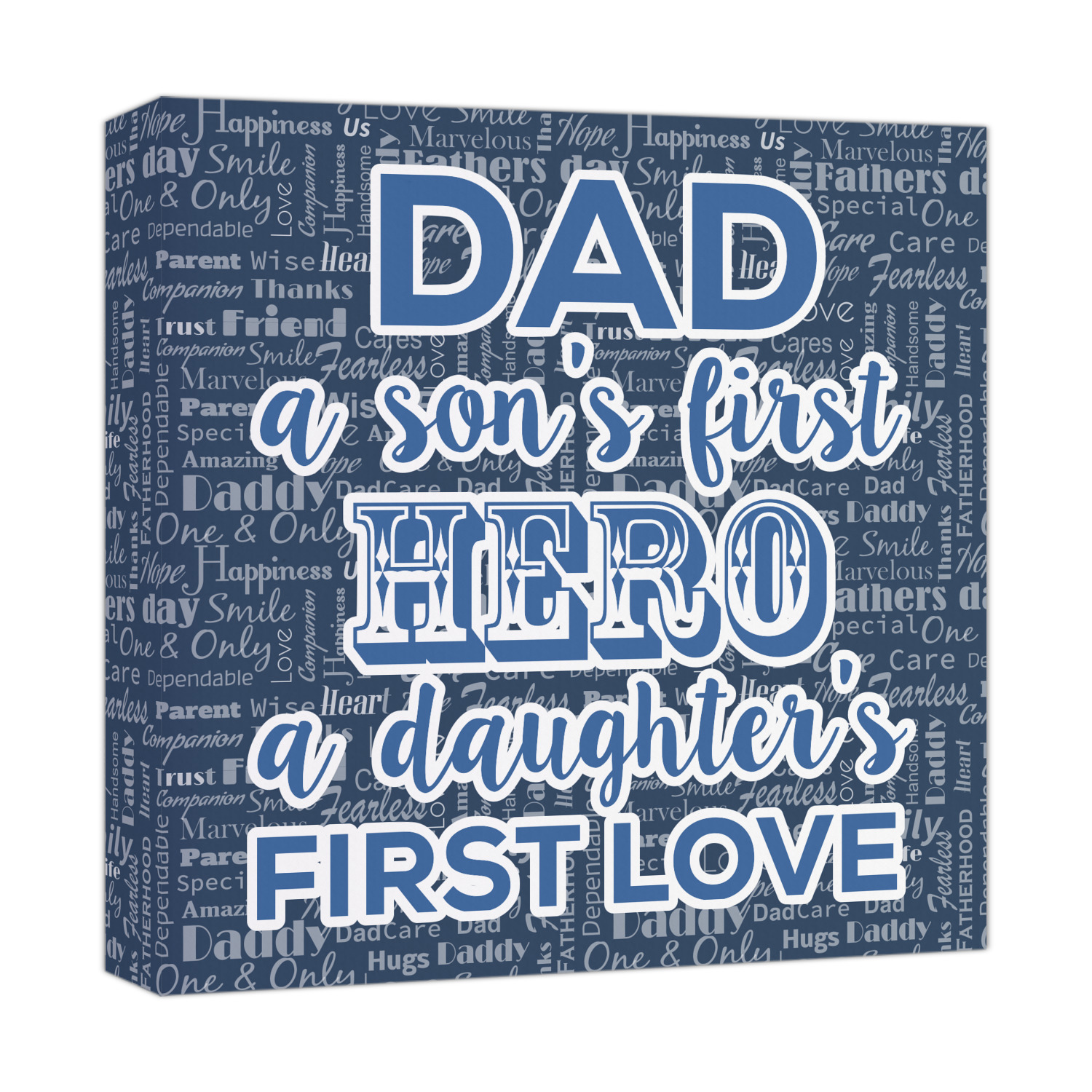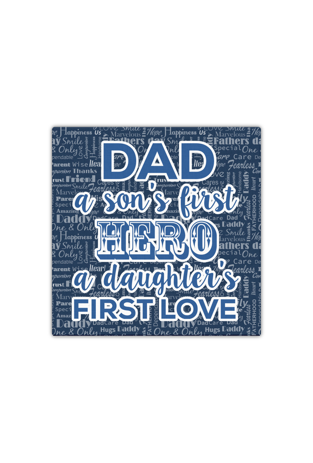 The background of this design is a fun word cloud that says different words to describe a father like "friend," "thanks," "father's day," "happiness," and more. The design is filled with a few different shades of blue and a little accent of white. The main graphic is a quote that says "Dad, a son's first hero, a daughter's first love." What a sweet design for Father's Day!