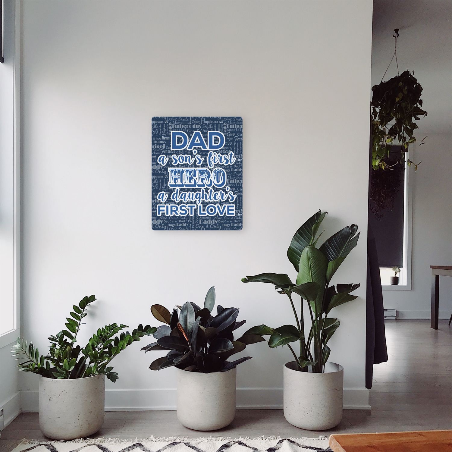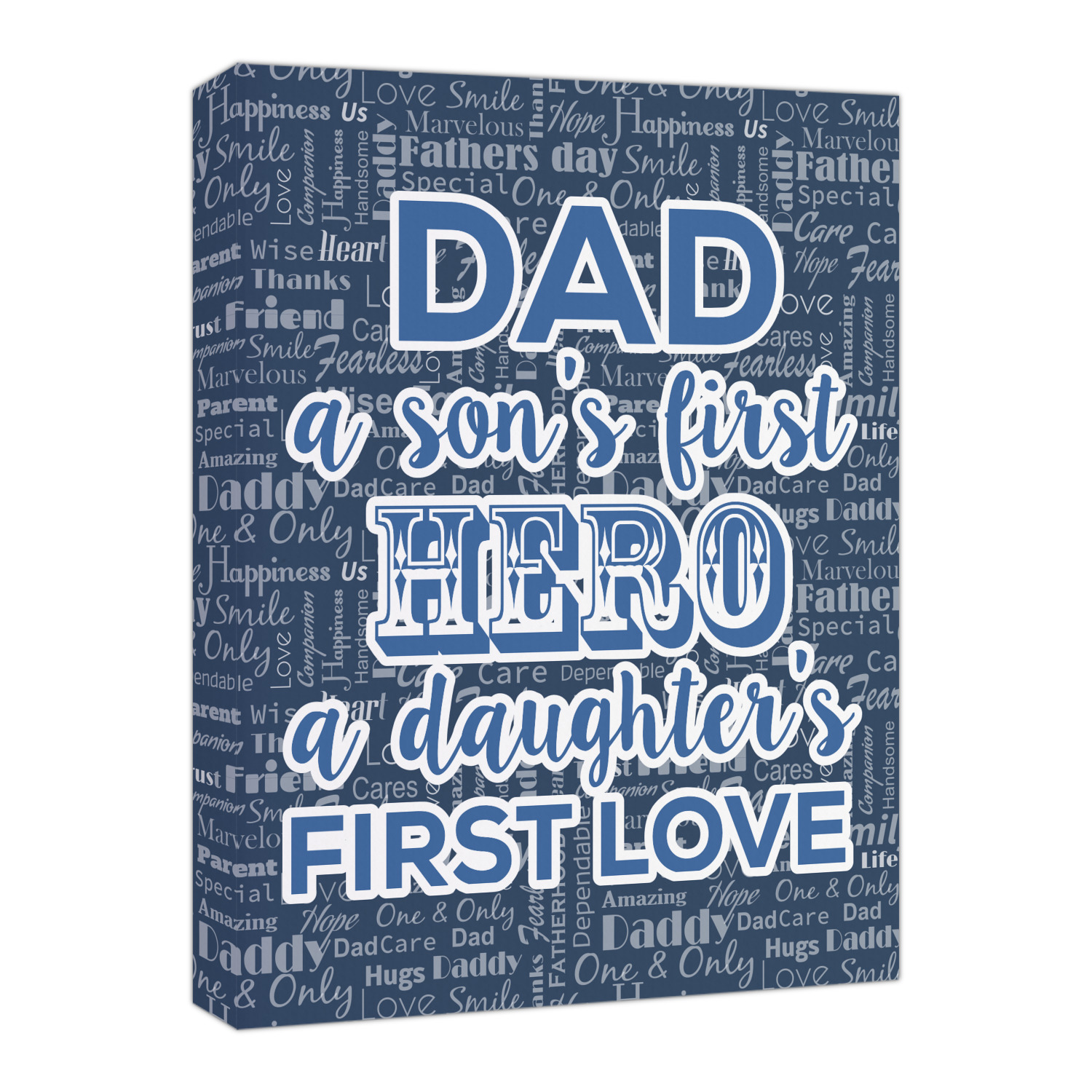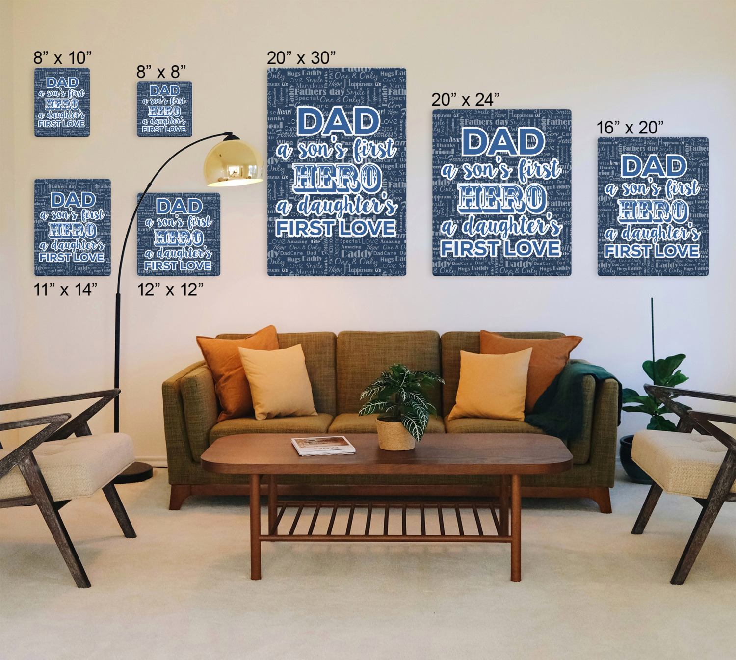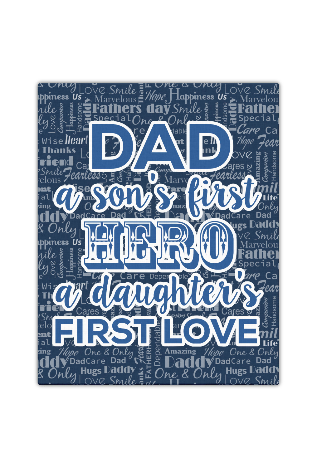 The background of this design is a fun word cloud that says different words to describe a father like "friend," "thanks," "father's day," "happiness," and more. The design is filled with a few different shades of blue and a little accent of white. The main graphic is a quote that says "Dad, a son's first hero, a daughter's first love." What a sweet design for Father's Day!