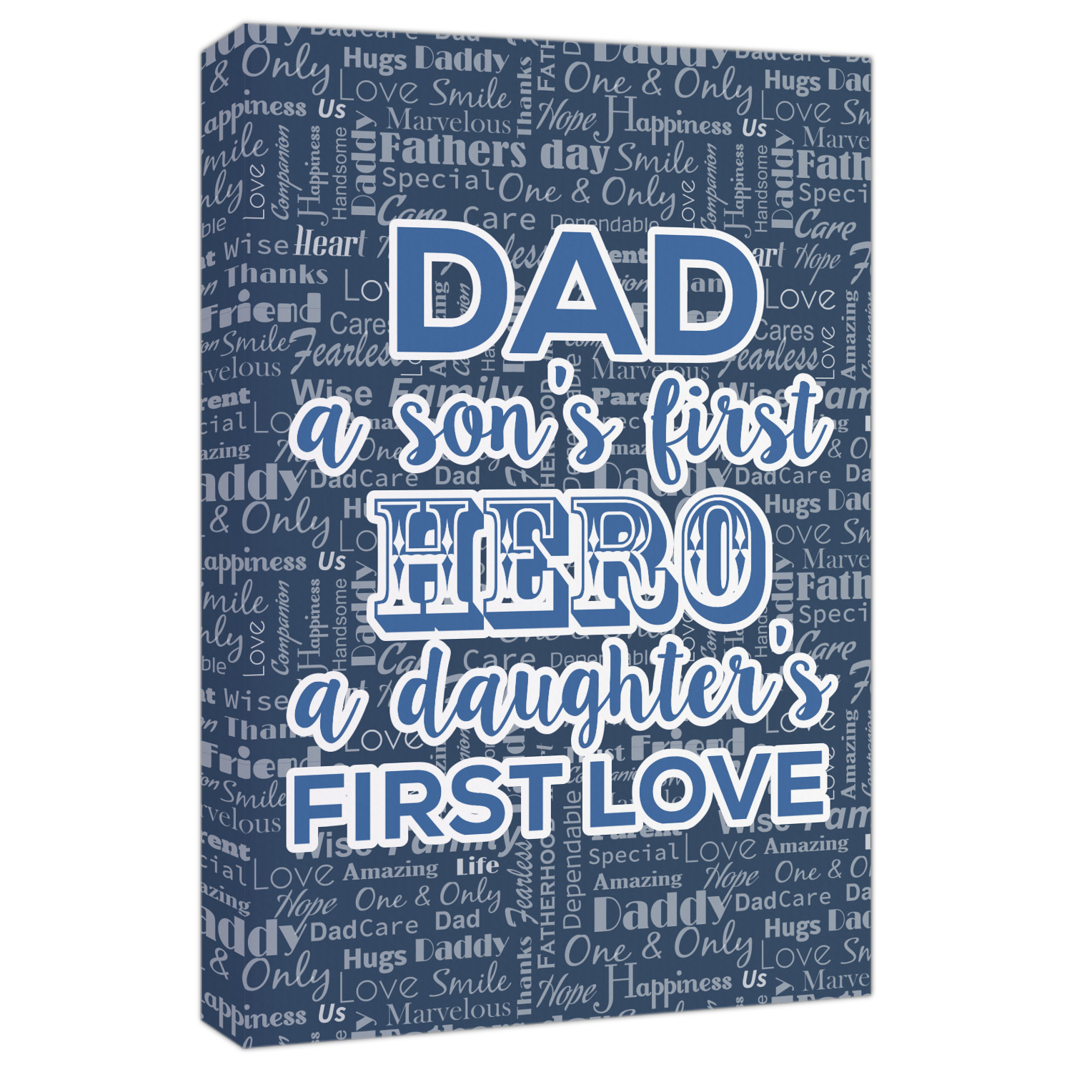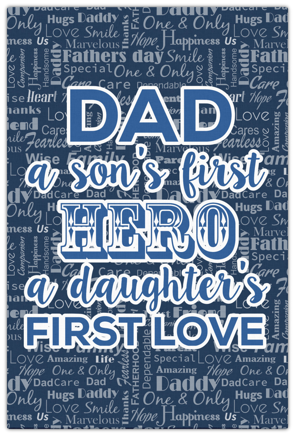 The background of this design is a fun word cloud that says different words to describe a father like "friend," "thanks," "father's day," "happiness," and more. The design is filled with a few different shades of blue and a little accent of white. The main graphic is a quote that says "Dad, a son's first hero, a daughter's first love." What a sweet design for Father's Day!