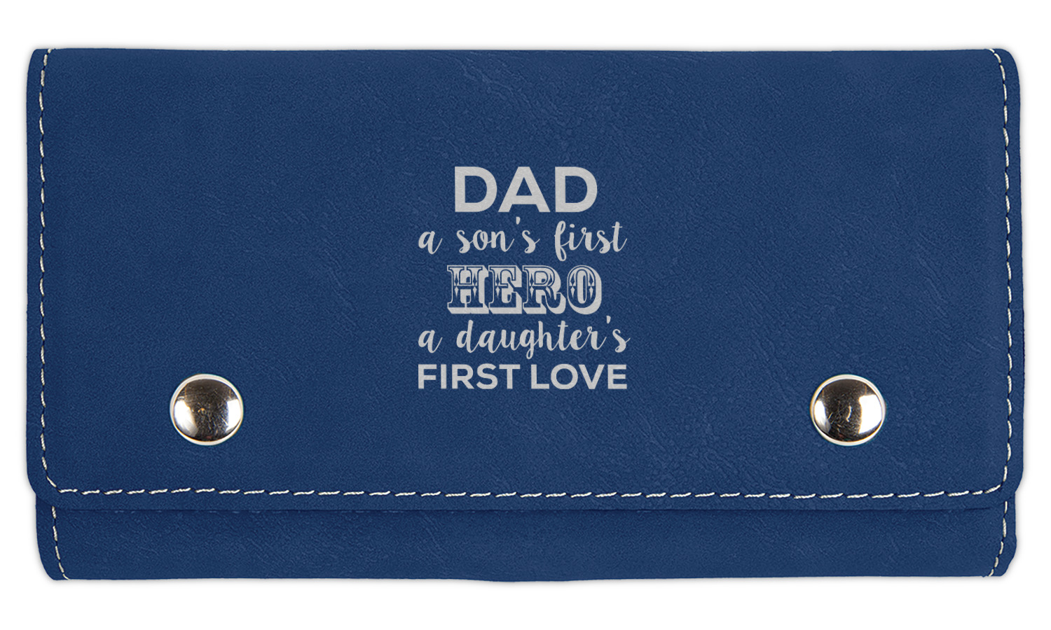 The background of this design is a fun word cloud that says different words to describe a father like "friend," "thanks," "father's day," "happiness," and more. The design is filled with a few different shades of blue and a little accent of white. The main graphic is a quote that says "Dad, a son's first hero, a daughter's first love." What a sweet design for Father's Day!