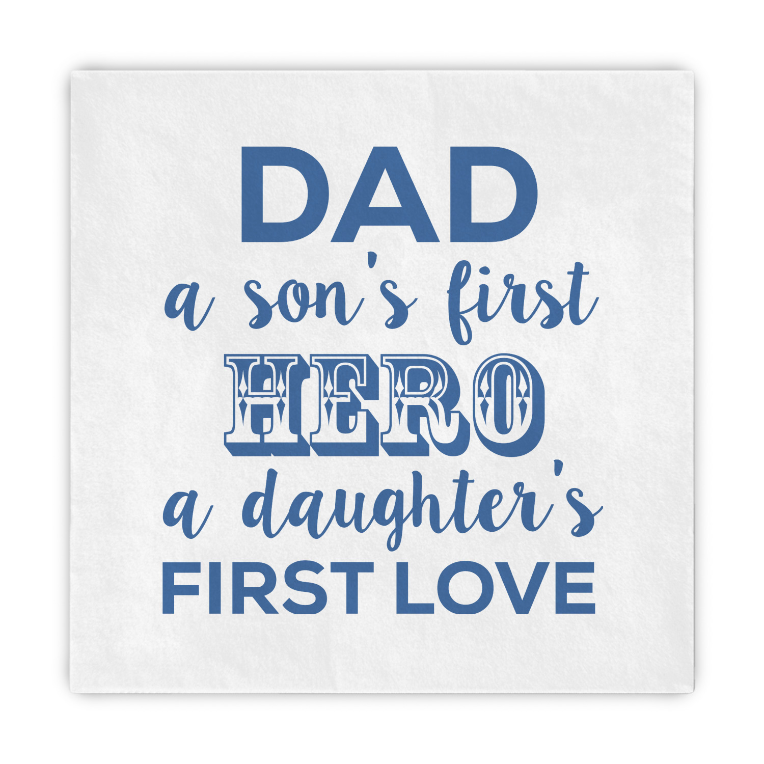 The background of this design is a fun word cloud that says different words to describe a father like "friend," "thanks," "father's day," "happiness," and more. The design is filled with a few different shades of blue and a little accent of white. The main graphic is a quote that says "Dad, a son's first hero, a daughter's first love." What a sweet design for Father's Day!