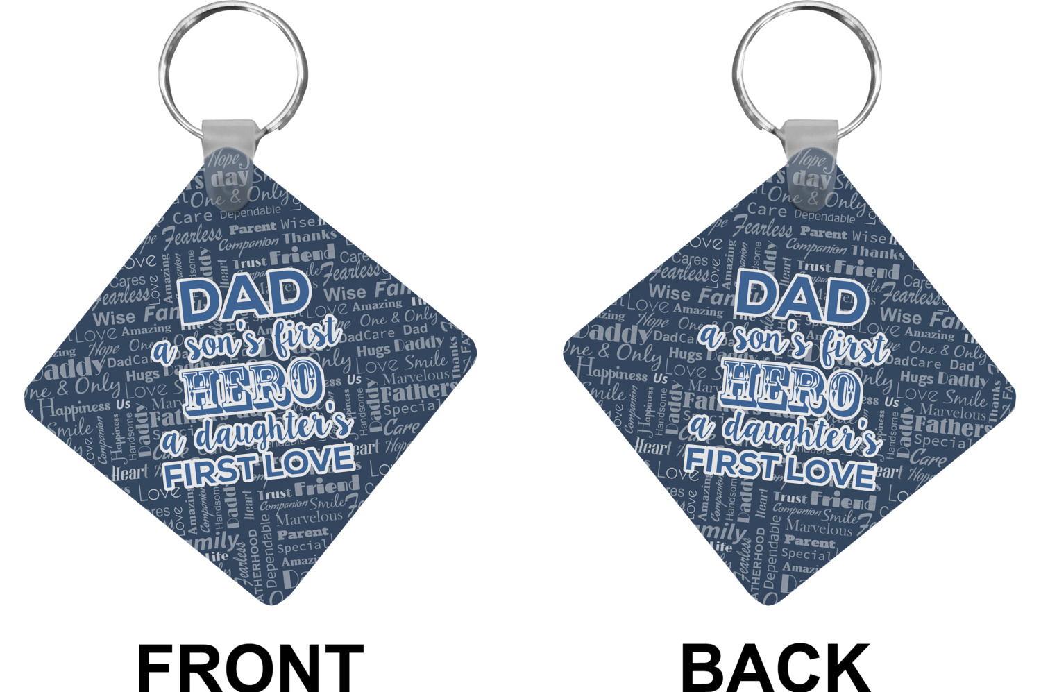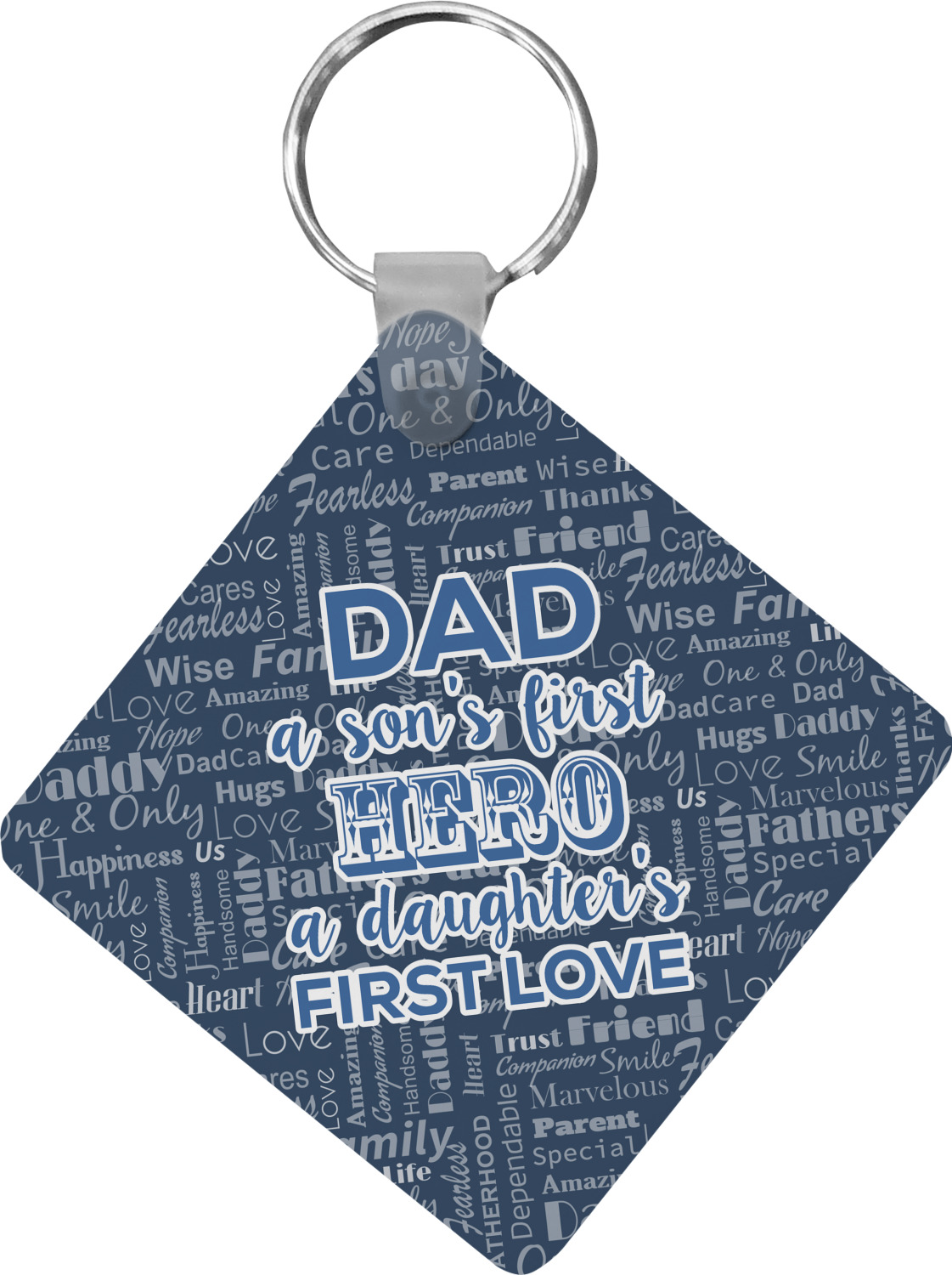 The background of this design is a fun word cloud that says different words to describe a father like "friend," "thanks," "father's day," "happiness," and more. The design is filled with a few different shades of blue and a little accent of white. The main graphic is a quote that says "Dad, a son's first hero, a daughter's first love." What a sweet design for Father's Day!