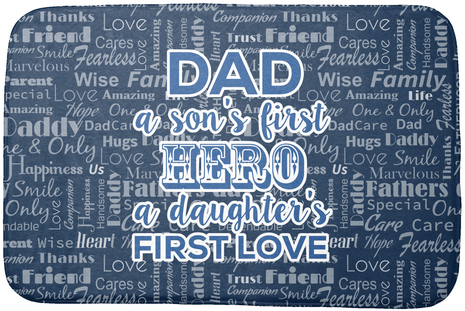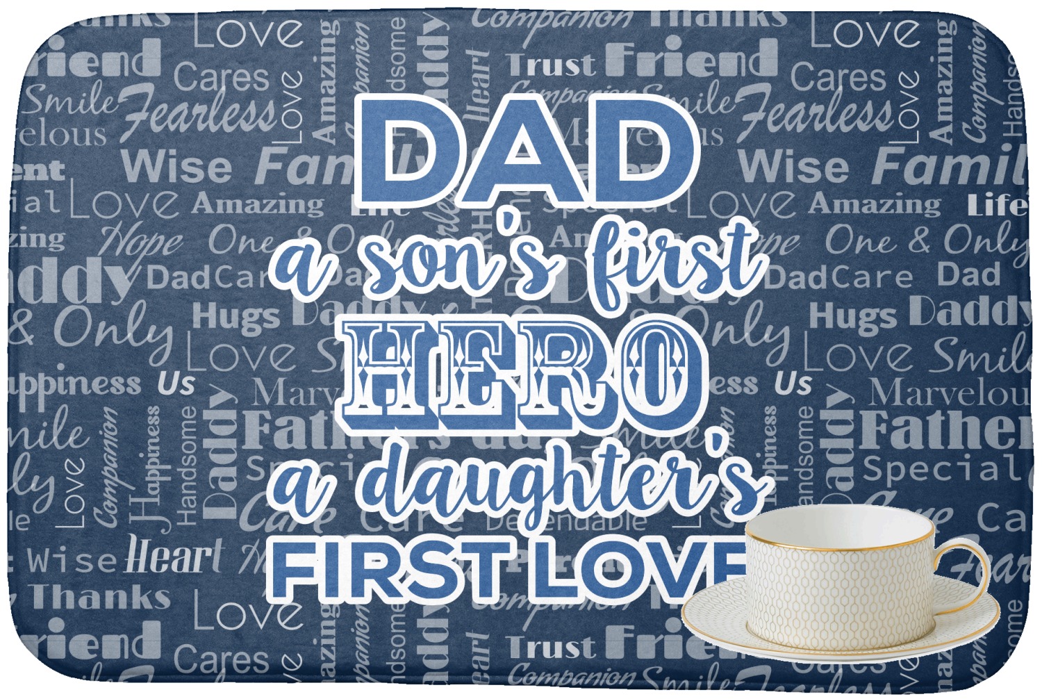 The background of this design is a fun word cloud that says different words to describe a father like "friend," "thanks," "father's day," "happiness," and more. The design is filled with a few different shades of blue and a little accent of white. The main graphic is a quote that says "Dad, a son's first hero, a daughter's first love." What a sweet design for Father's Day!