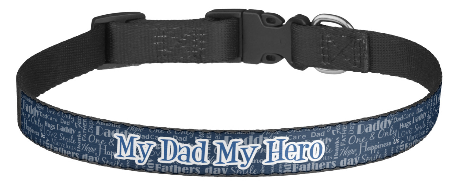 This sturdy collar, made from a durable nylon weave, will outlive your dog's episodes of excited tugging and pulling. Courtesy of its thick plastic buckle and adjuster, this collar is adjustable and accommodating of any dog. Structurally, the collar is a single piece of nylon weave that is sewn together, and features a solid metal loop where you can attach a leash or dog tag. We print and display your dog's name and pattern across the middle of the personalized dog collar.