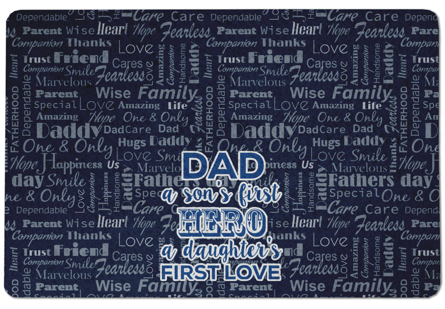 The background of this design is a fun word cloud that says different words to describe a father like "friend," "thanks," "father's day," "happiness," and more. The design is filled with a few different shades of blue and a little accent of white. The main graphic is a quote that says "Dad, a son's first hero, a daughter's first love." What a sweet design for Father's Day!