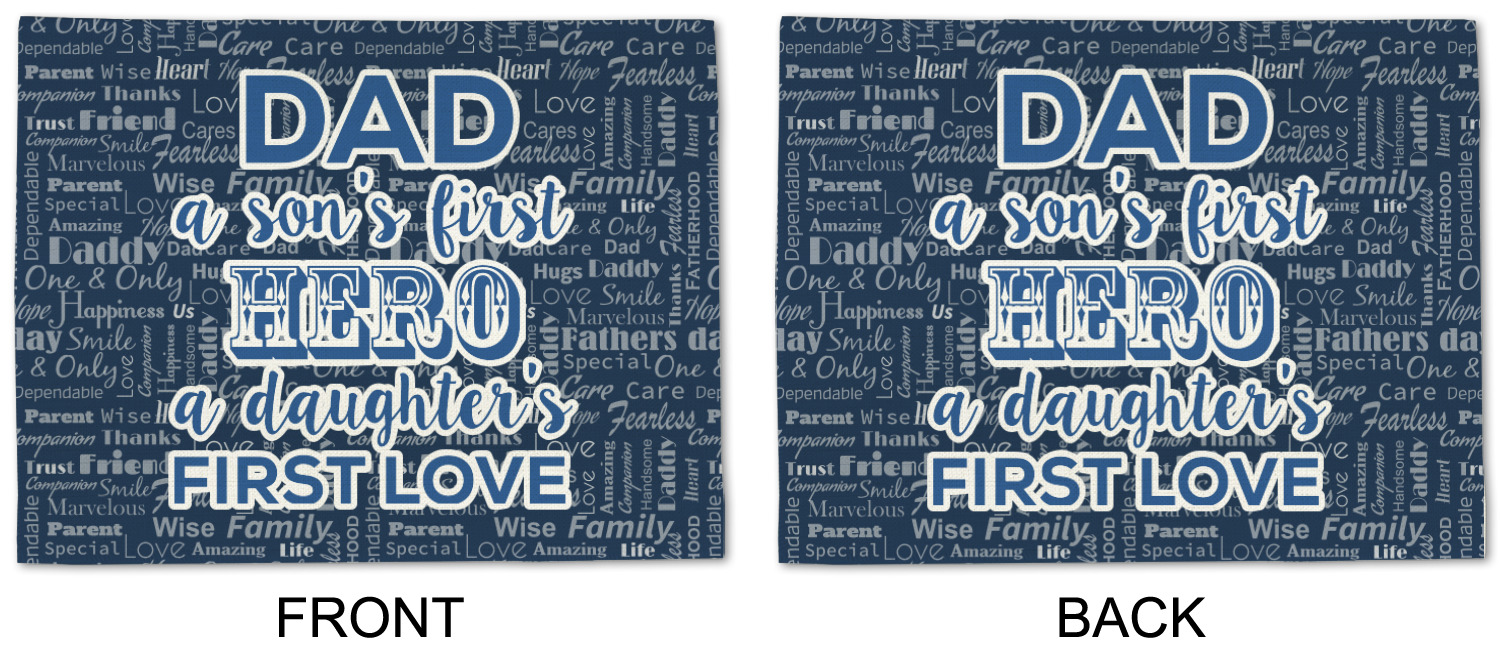 The background of this design is a fun word cloud that says different words to describe a father like "friend," "thanks," "father's day," "happiness," and more. The design is filled with a few different shades of blue and a little accent of white. The main graphic is a quote that says "Dad, a son's first hero, a daughter's first love." What a sweet design for Father's Day!