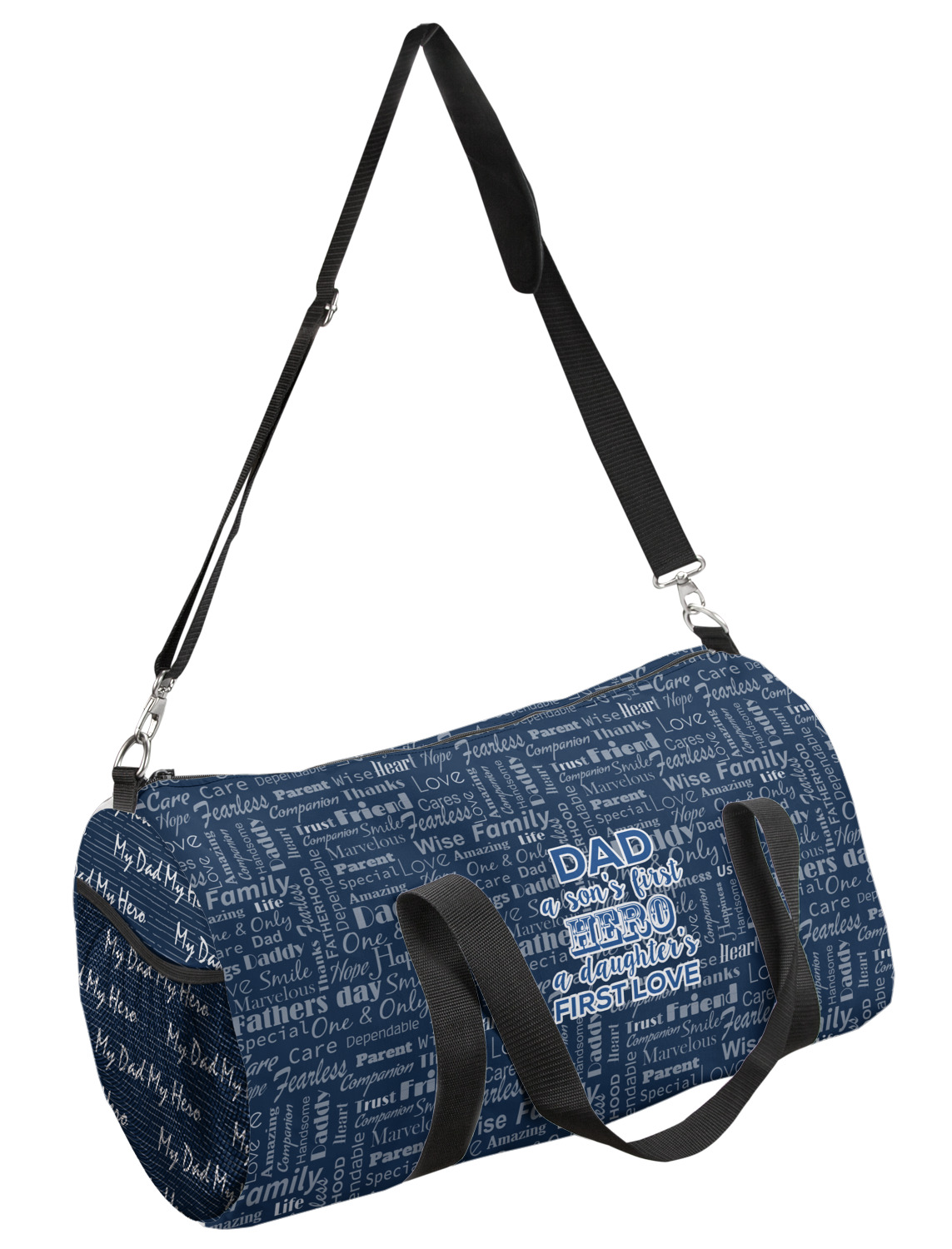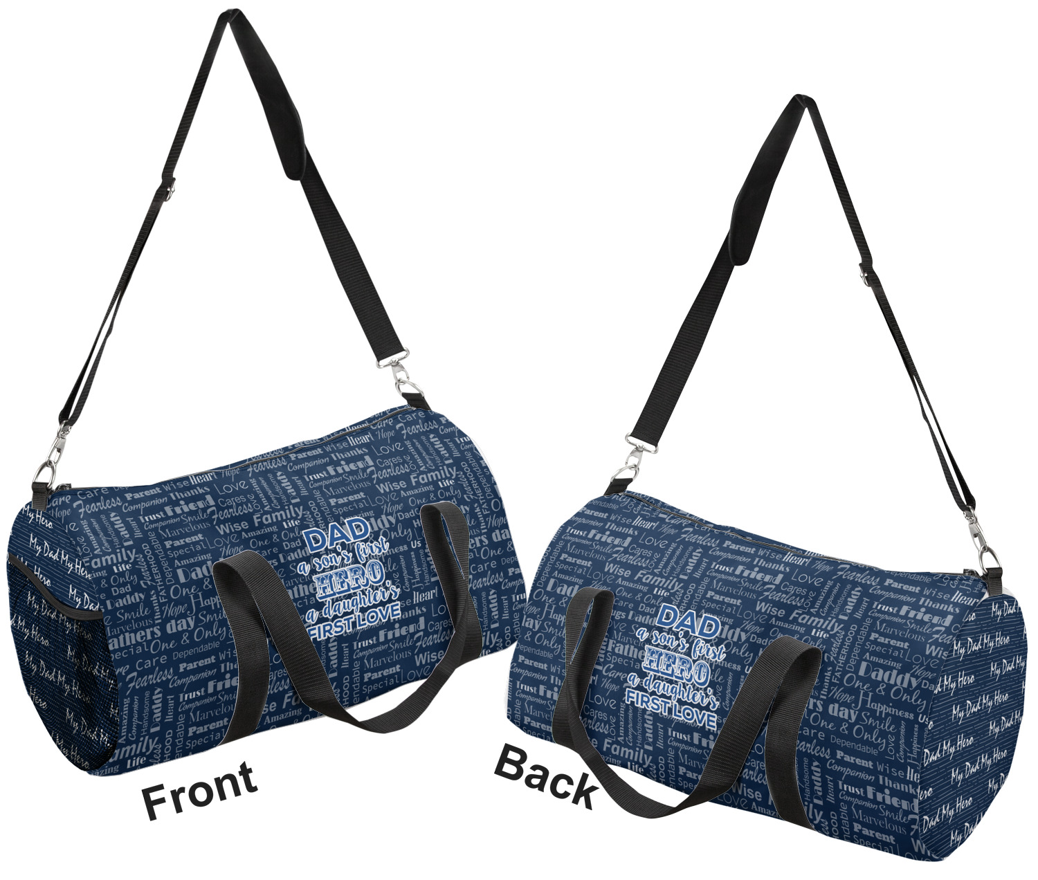This duffle is a sturdy bag made of a canvas material. It comes in two sizes: Small (19"W x 9.5"H x 9.5"D) and Large (23"W x 12"H x 12"D). The bag is a cylindrical shape with a black adjustable strap and two handles. On one side is an elastic pouch to put a waterbottle or other small item. Your product will be sublimated with your design and is able to be designed on the front, back, and sides. Be sure to remember that the straps may cut into parts of your design if you upload your own artwork.