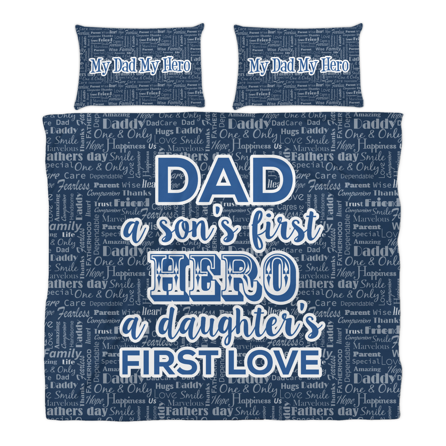 The background of this design is a fun word cloud that says different words to describe a father like "friend," "thanks," "father's day," "happiness," and more. The design is filled with a few different shades of blue and a little accent of white. The main graphic is a quote that says "Dad, a son's first hero, a daughter's first love." What a sweet design for Father's Day!