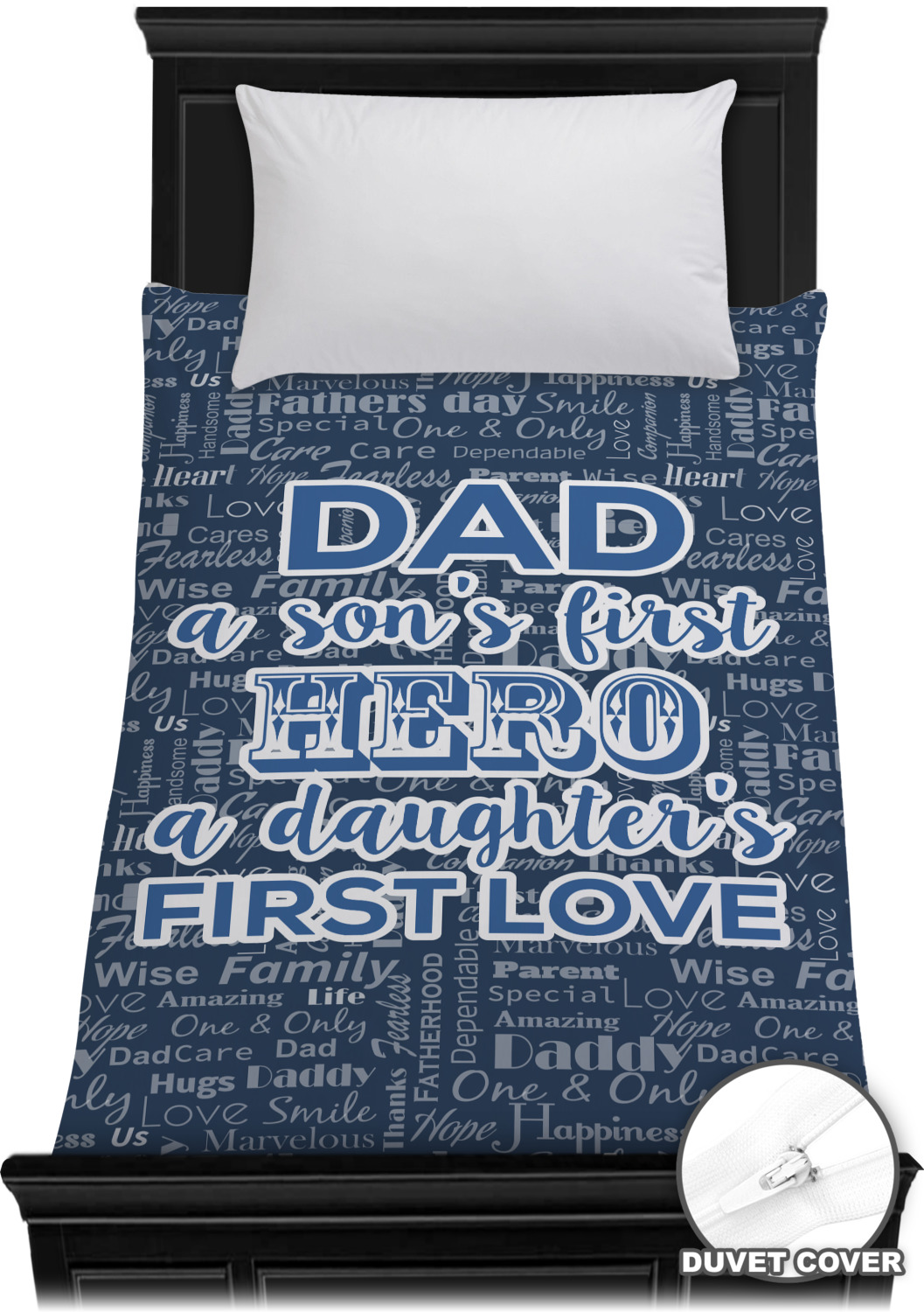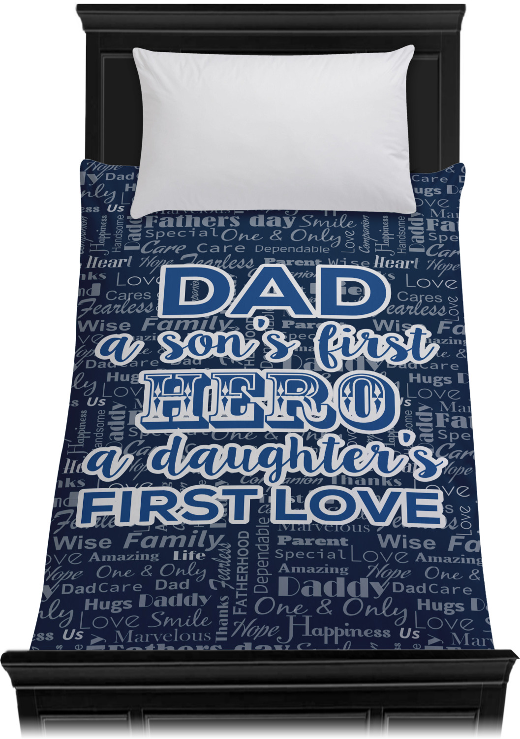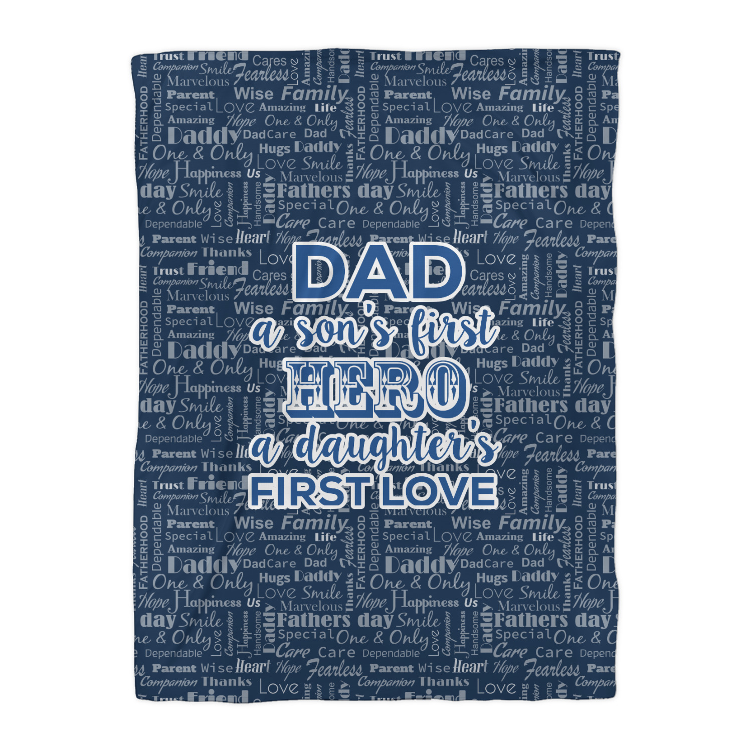 The background of this design is a fun word cloud that says different words to describe a father like "friend," "thanks," "father's day," "happiness," and more. The design is filled with a few different shades of blue and a little accent of white. The main graphic is a quote that says "Dad, a son's first hero, a daughter's first love." What a sweet design for Father's Day!