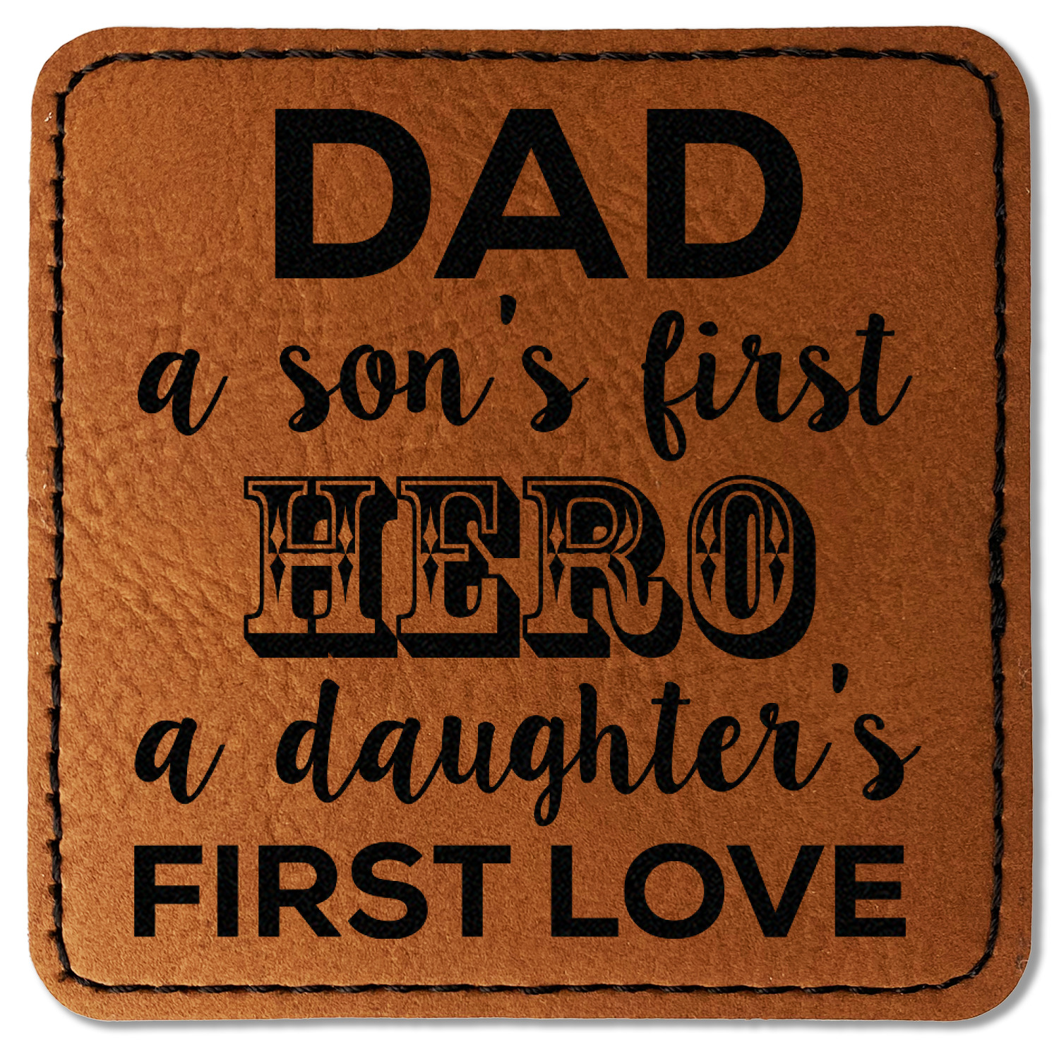 The background of this design is a fun word cloud that says different words to describe a father like "friend," "thanks," "father's day," "happiness," and more. The design is filled with a few different shades of blue and a little accent of white. The main graphic is a quote that says "Dad, a son's first hero, a daughter's first love." What a sweet design for Father's Day!