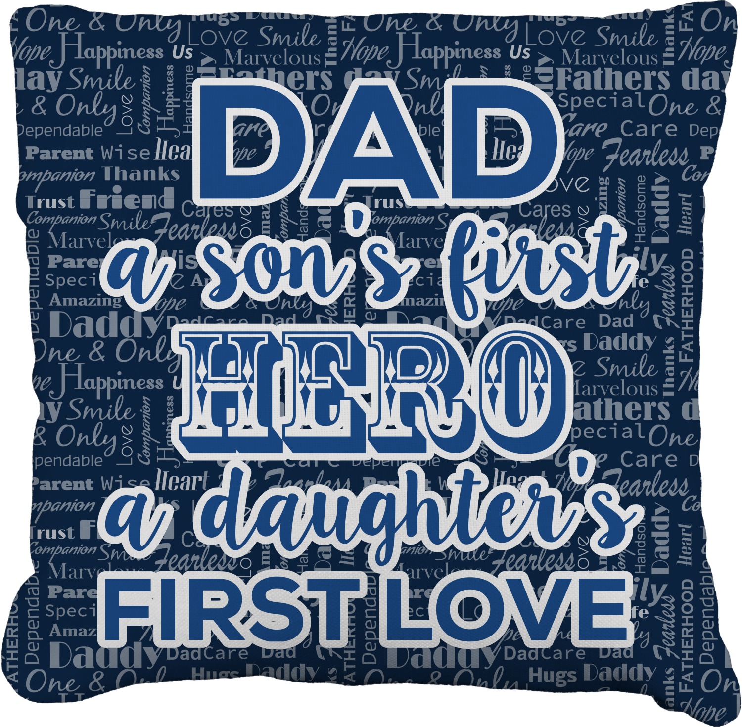 The background of this design is a fun word cloud that says different words to describe a father like "friend," "thanks," "father's day," "happiness," and more. The design is filled with a few different shades of blue and a little accent of white. The main graphic is a quote that says "Dad, a son's first hero, a daughter's first love." What a sweet design for Father's Day!