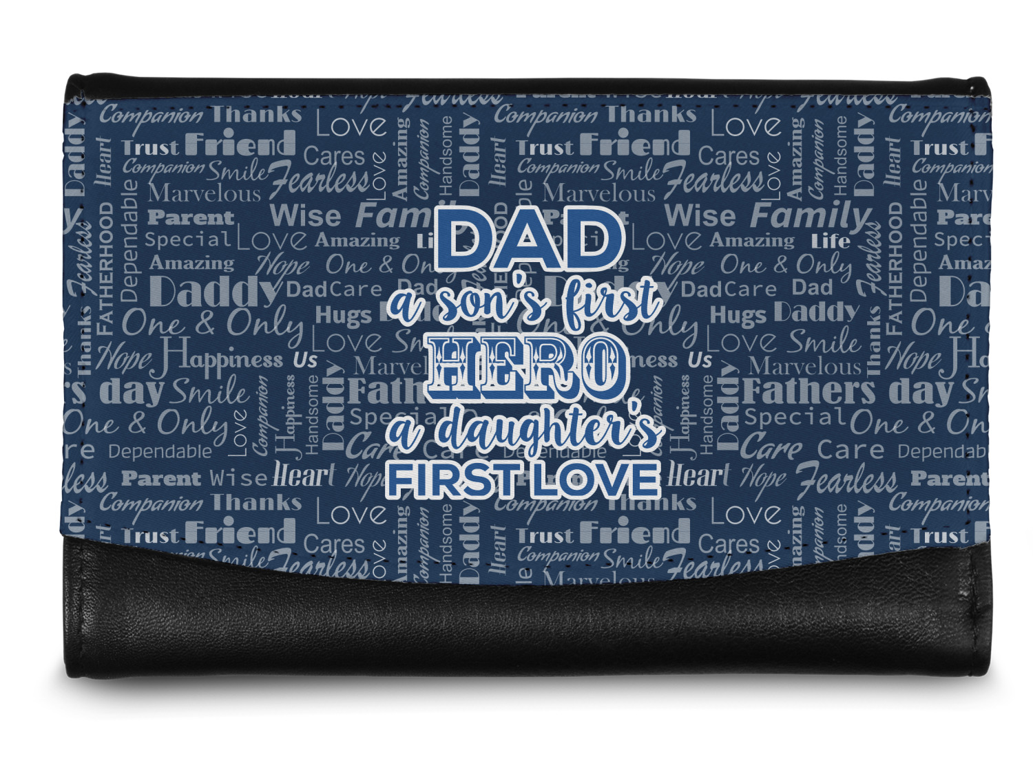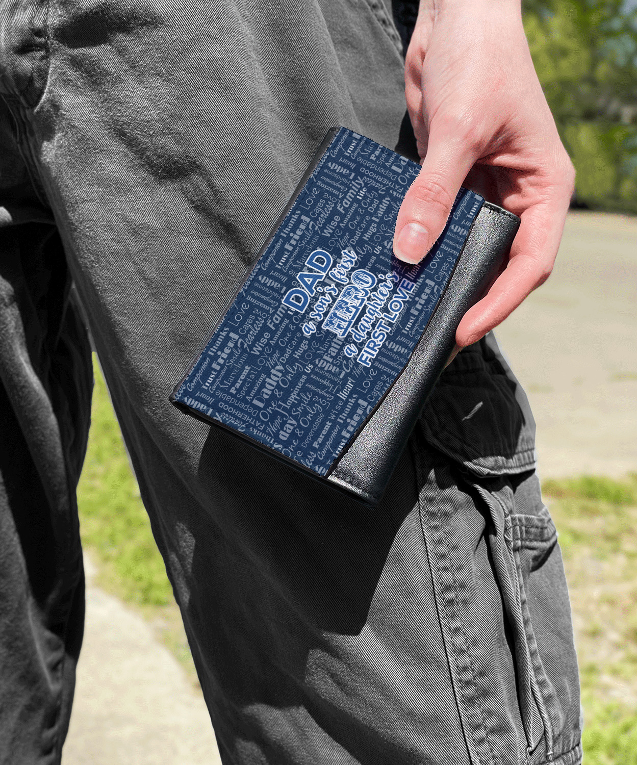 The compact size of this wallet - 5.5in wide, 3.5in tall and 0.75in thick when folded - makes it perfect to hold in hand and small enough to fit in a clutch or a normal size purse. The outside flap is customized with your choice of artwork and closes with a snap closure - with two different snaps to allow it to be adjusted when storing more items - to securely fasten the flap.