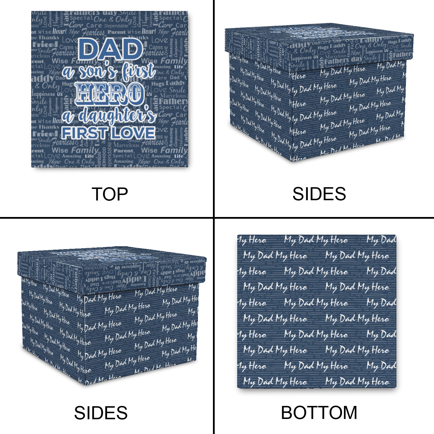 The background of this design is a fun word cloud that says different words to describe a father like "friend," "thanks," "father's day," "happiness," and more. The design is filled with a few different shades of blue and a little accent of white. The main graphic is a quote that says "Dad, a son's first hero, a daughter's first love." What a sweet design for Father's Day!