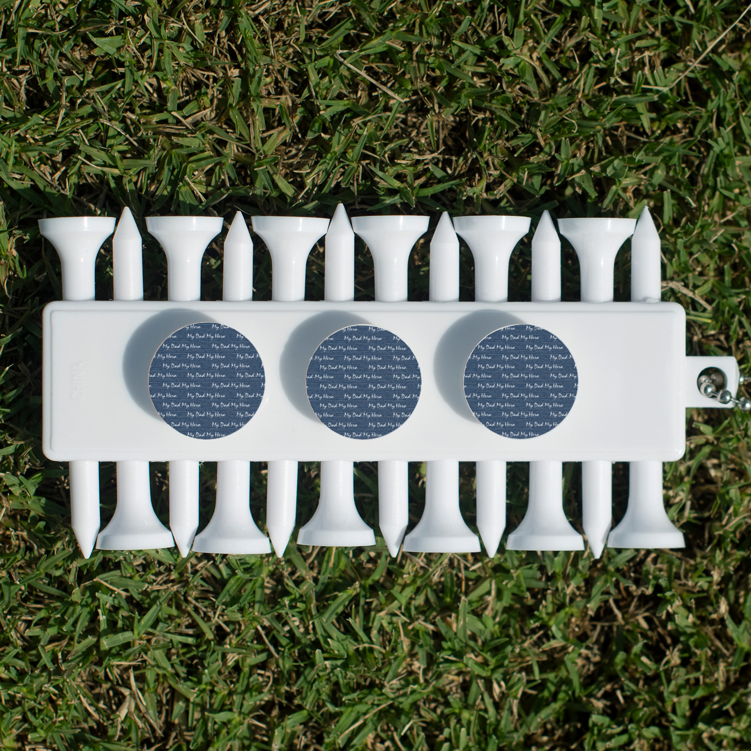 With 12 tees on a lightweight, portable key chain, it almost ensures a great 18 holes. Our tees are made of white plastic and are a little over 2". Design the front and the back of the golf tee holder. Pick from over a hundred designs, colors, and personalization styles! The set even comes with three removable ball markers as well!