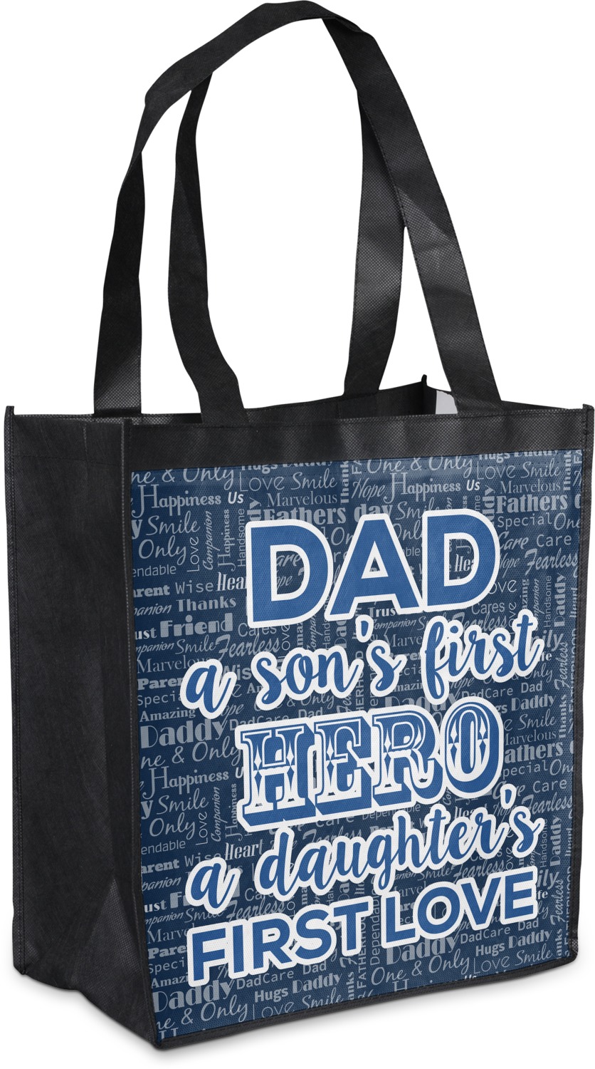 Made from a durable, biodegradable material, these reusable shopping bags can support up to 30 pounds of weight. With two large handles, measuring at 8.5 inches each, these personalized tote bags are easy to carry to your vehicle or home. The bag itself is 12 by 13.5 inches, and can expand to a depth of 7 inches. Your customization is printed on both the front and back, while the remaining sides, trim, and handle are a sleek, charcoal black.
