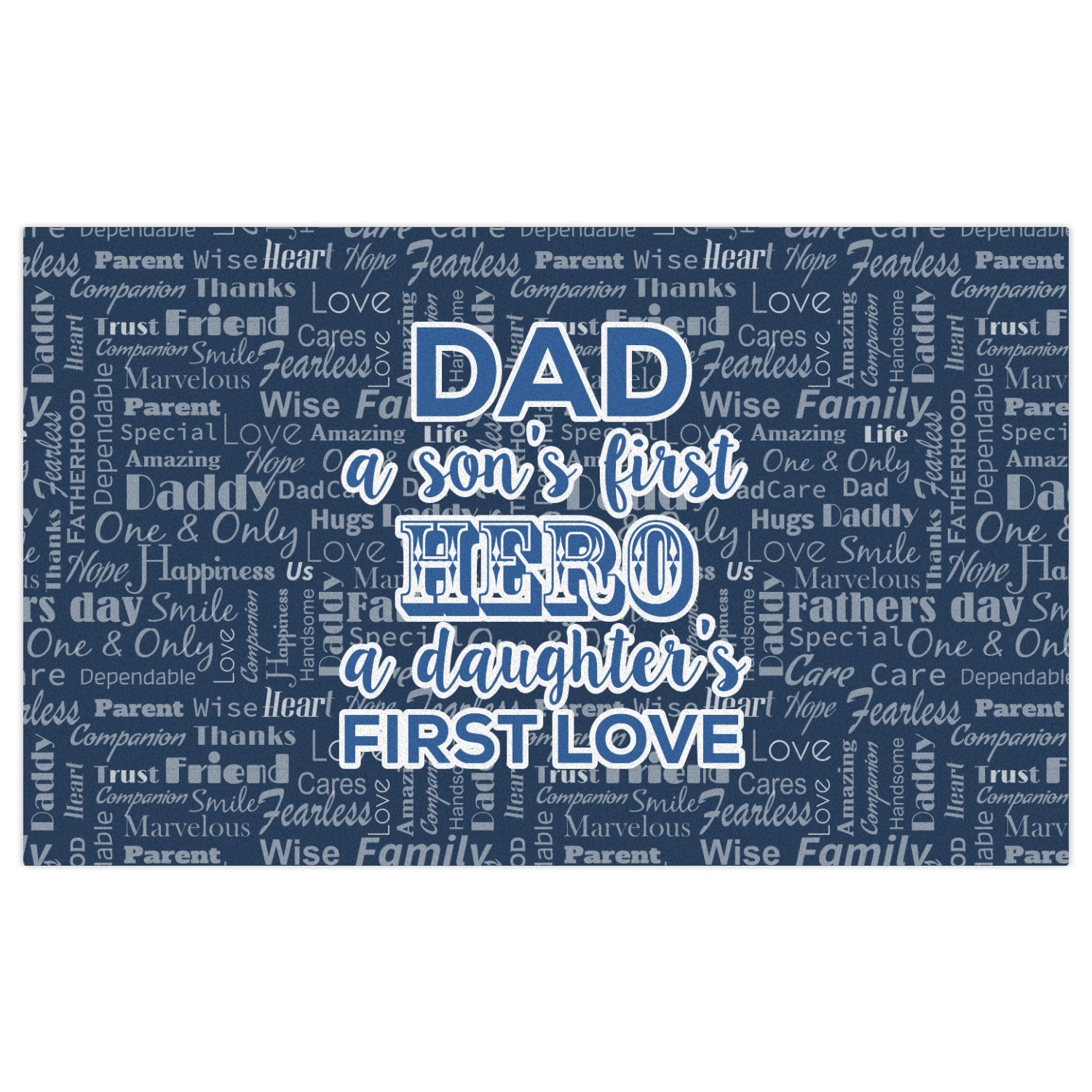The background of this design is a fun word cloud that says different words to describe a father like "friend," "thanks," "father's day," "happiness," and more. The design is filled with a few different shades of blue and a little accent of white. The main graphic is a quote that says "Dad, a son's first hero, a daughter's first love." What a sweet design for Father's Day!