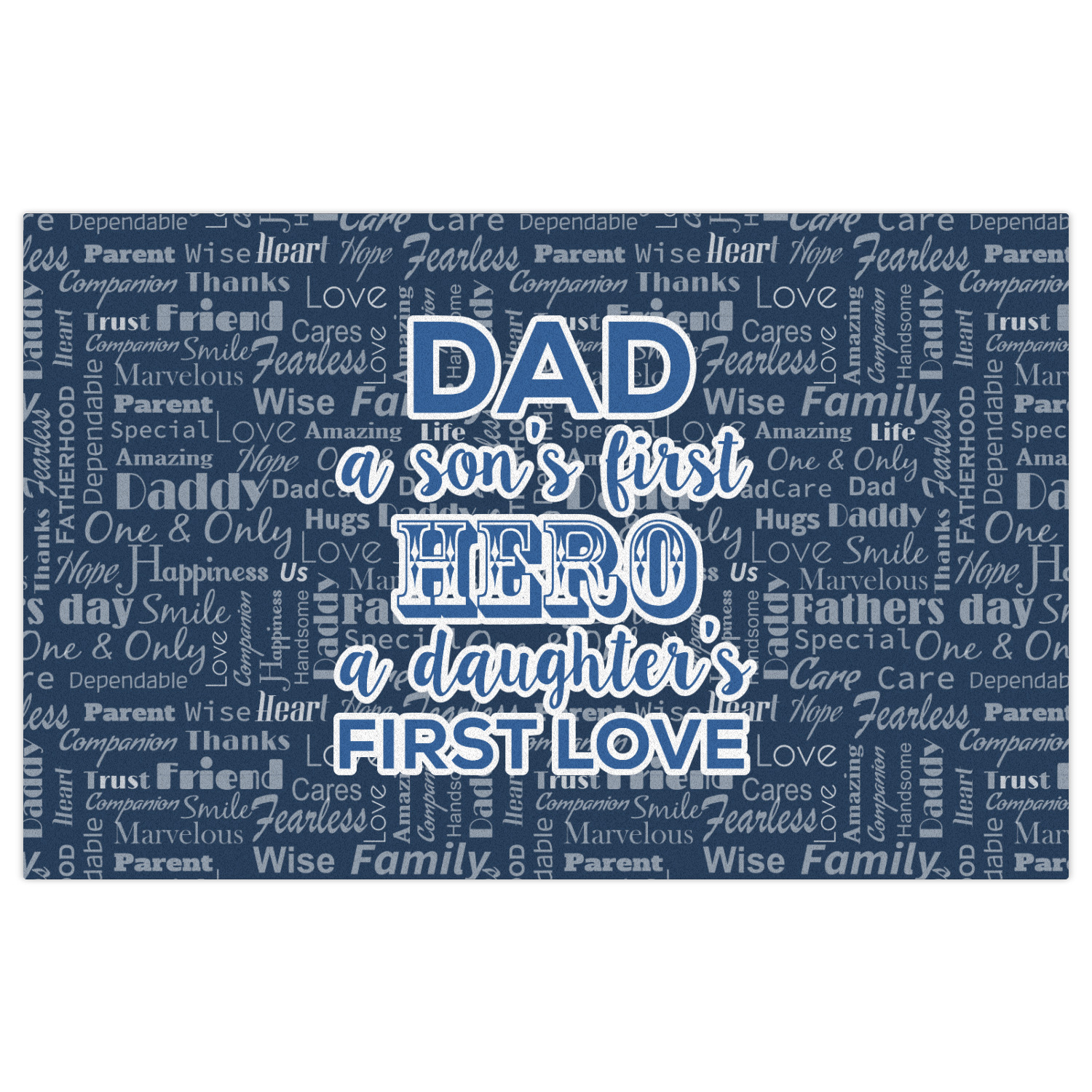 The background of this design is a fun word cloud that says different words to describe a father like "friend," "thanks," "father's day," "happiness," and more. The design is filled with a few different shades of blue and a little accent of white. The main graphic is a quote that says "Dad, a son's first hero, a daughter's first love." What a sweet design for Father's Day!