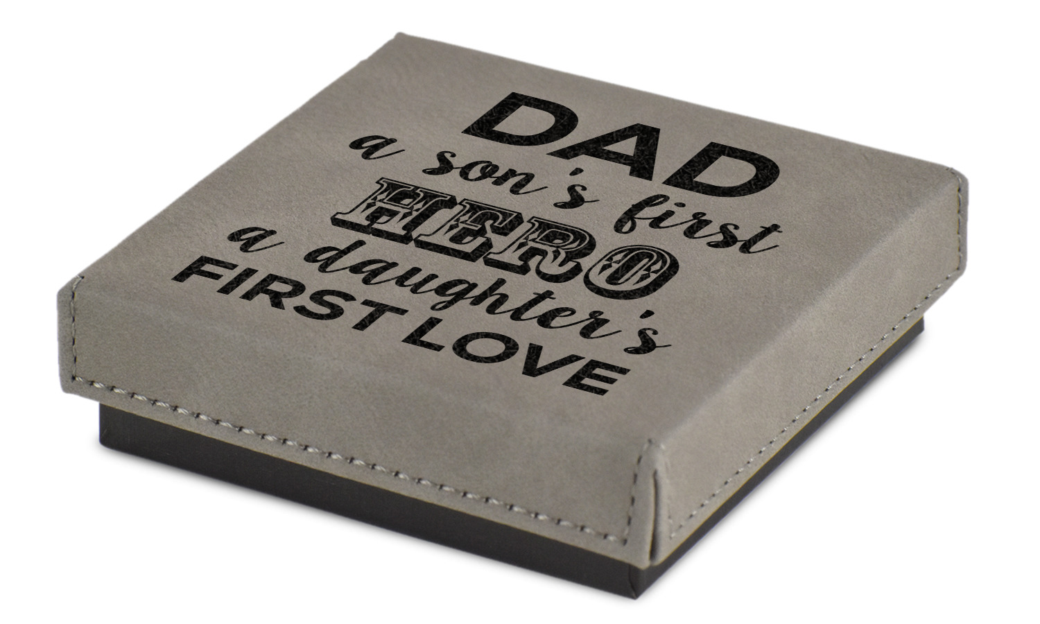 This jewelry gift box measures 3.5 inches long by 3.5 inches wide, and 1 inch deep. The box fits different sized jewelry items such as bracelets, necklaces, watches, earrings, rings and more. Engraved with a laser this high quality paper board and faux leather jewelry gift box is unique and makes any gift stand out.