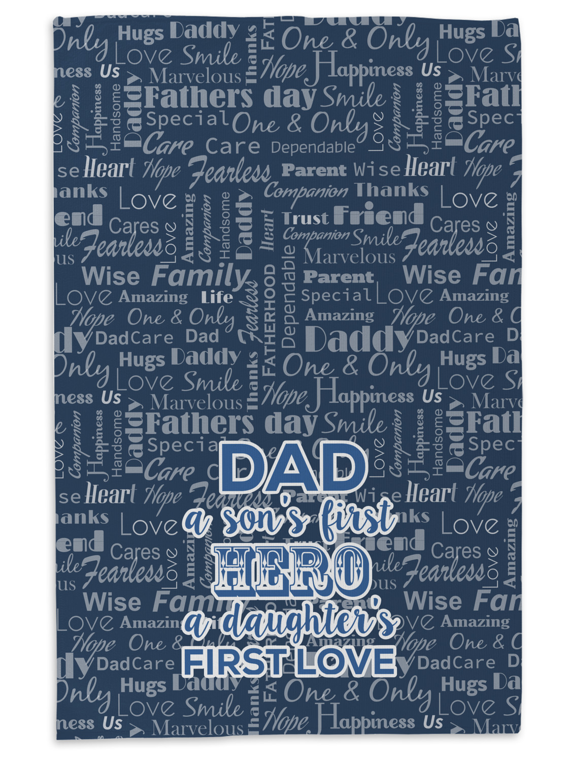 The background of this design is a fun word cloud that says different words to describe a father like "friend," "thanks," "father's day," "happiness," and more. The design is filled with a few different shades of blue and a little accent of white. The main graphic is a quote that says "Dad, a son's first hero, a daughter's first love." What a sweet design for Father's Day!