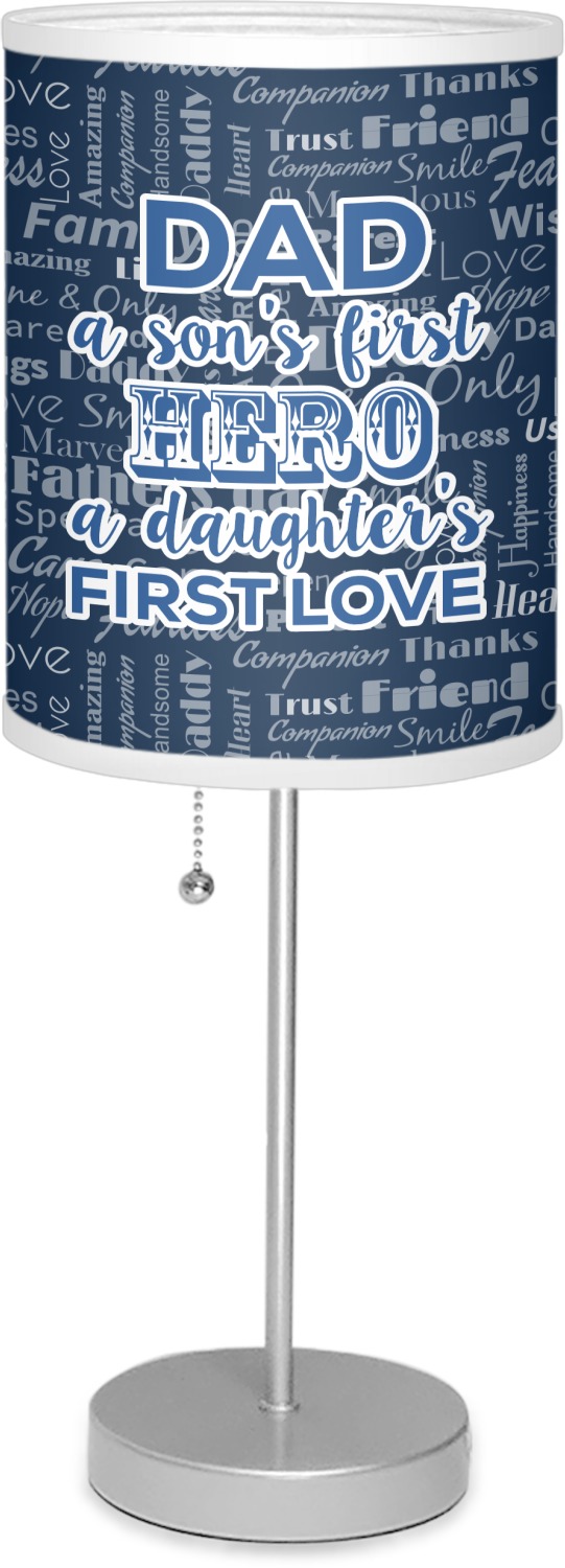 The background of this design is a fun word cloud that says different words to describe a father like "friend," "thanks," "father's day," "happiness," and more. The design is filled with a few different shades of blue and a little accent of white. The main graphic is a quote that says "Dad, a son's first hero, a daughter's first love." What a sweet design for Father's Day!