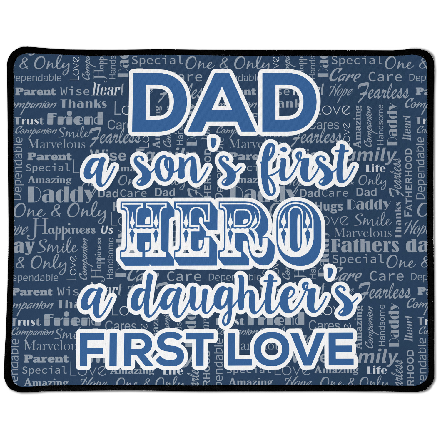 The background of this design is a fun word cloud that says different words to describe a father like "friend," "thanks," "father's day," "happiness," and more. The design is filled with a few different shades of blue and a little accent of white. The main graphic is a quote that says "Dad, a son's first hero, a daughter's first love." What a sweet design for Father's Day!