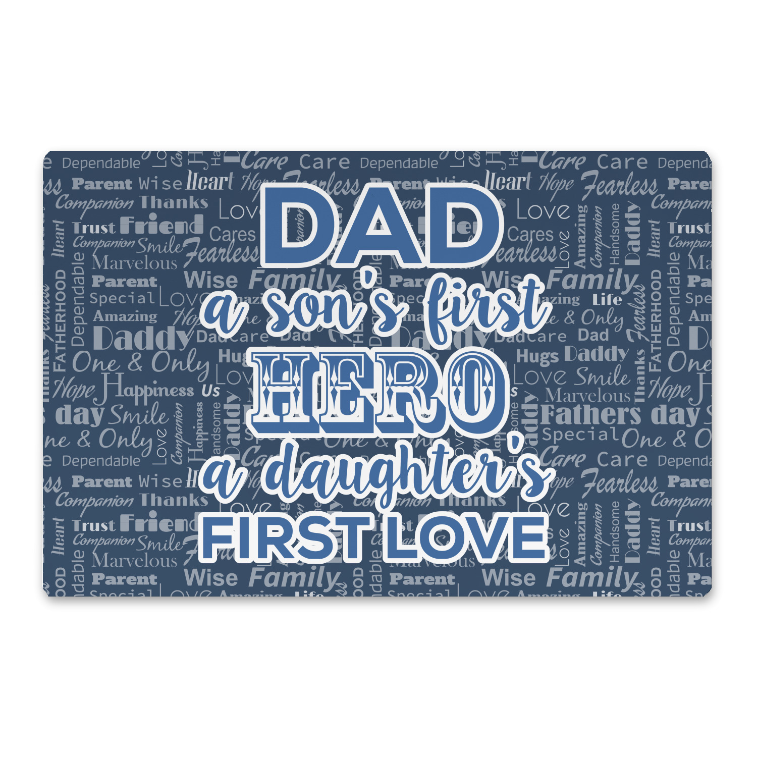 The background of this design is a fun word cloud that says different words to describe a father like "friend," "thanks," "father's day," "happiness," and more. The design is filled with a few different shades of blue and a little accent of white. The main graphic is a quote that says "Dad, a son's first hero, a daughter's first love." What a sweet design for Father's Day!