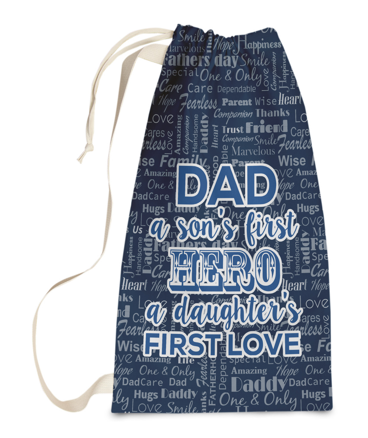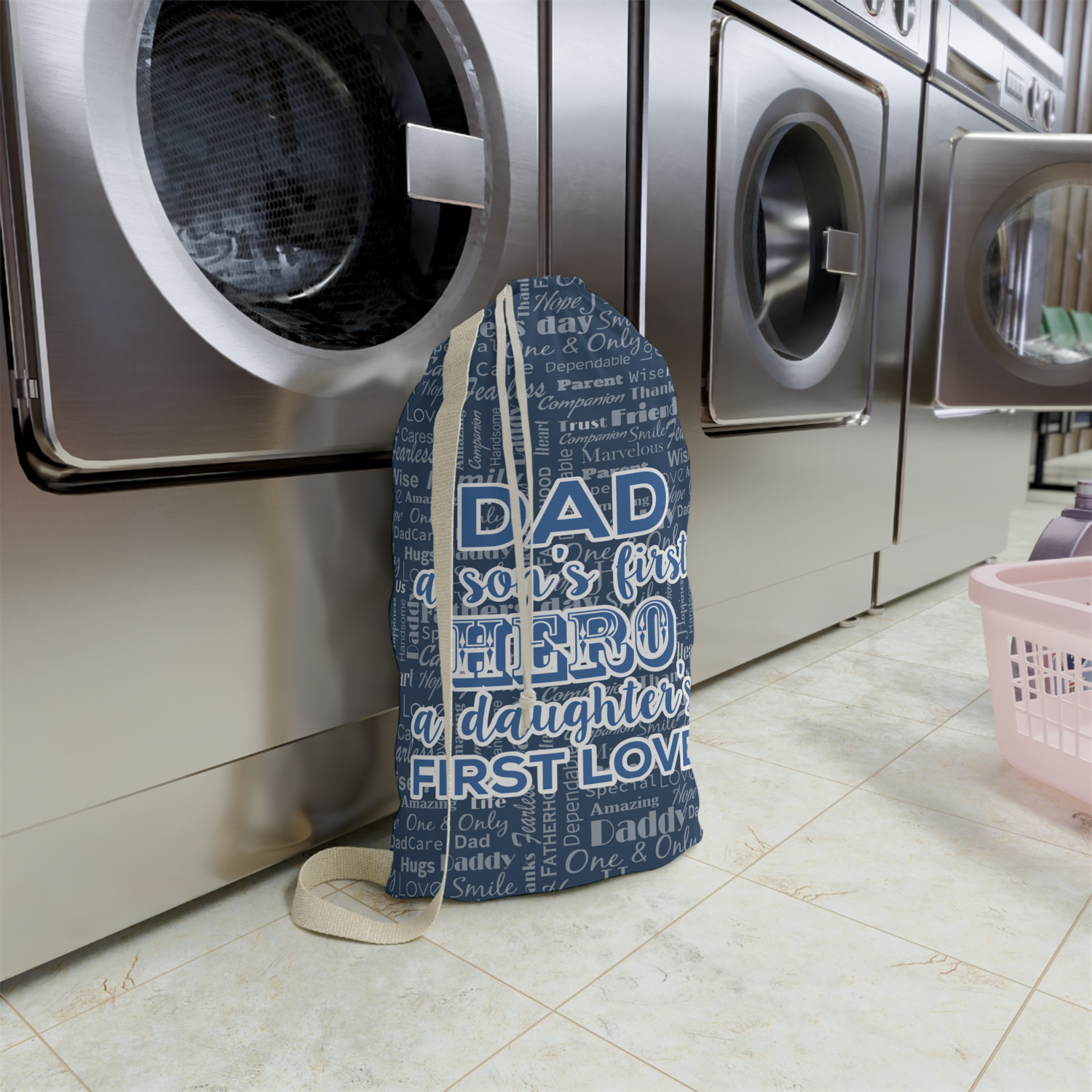 Carry your laundry in style with these customized laundry bags. Available in two sizes, featuring a natural colored woven strap and a cinch cord, these bags hold a lot of clothes or anything else you want to fit in them.