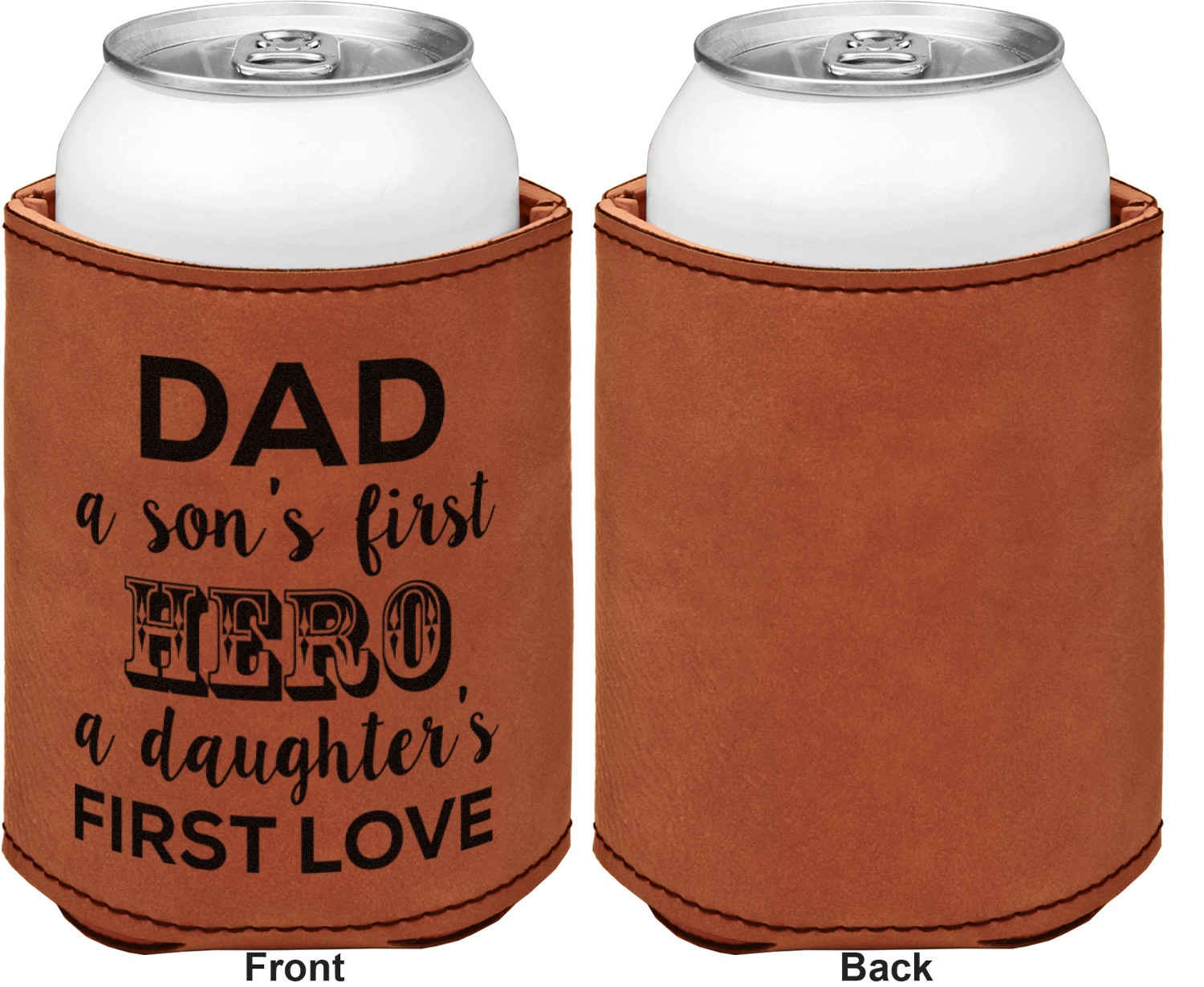 This can sleeve is made from a cognac-brown leatherette and stitched with a sturdy, black thread. A slim padding lines the inside of your can sleeve to allow for a better fit once your drink is inserted. The sleeve itself measures at 4 by 4.5 inches, allowing this custom can sleeve to accommodate most canned drinks. Your personalized design can be engraved on the front and back, or solely the front. When laser-engraved, your design appears as a black coloration which contrasts the leatherette nicely.