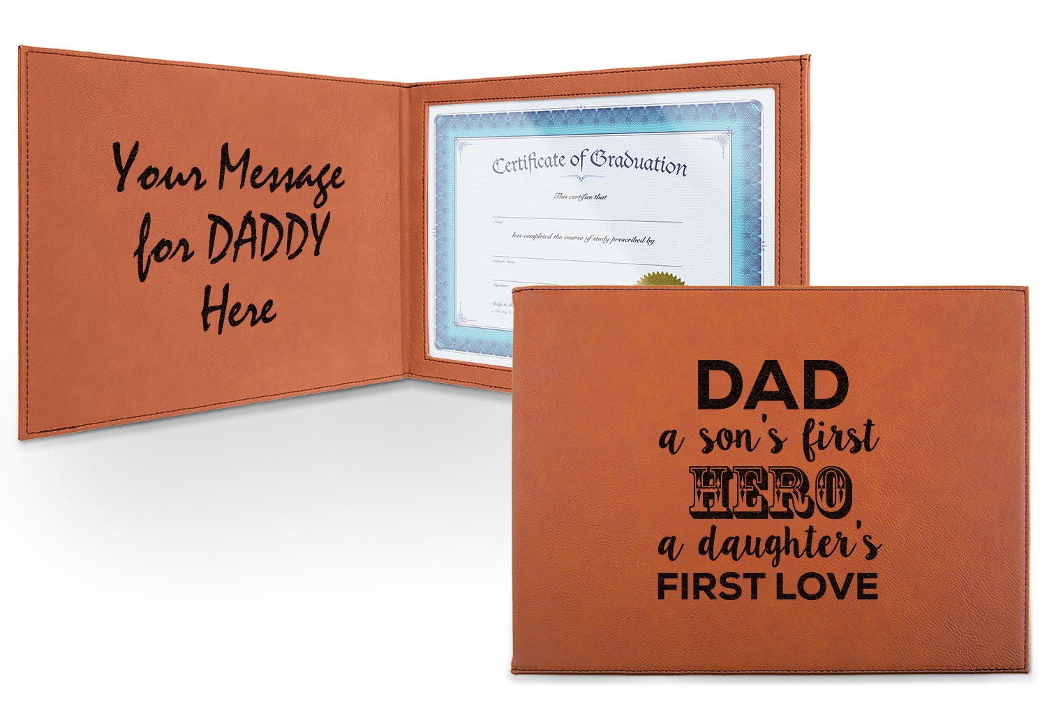 This cognac-colored, leatherette certificate jacket is the ideal way to display or store your hard-earned certificate. When closed, the custom certificate holder measures at 12 by 9 inches. The interior of the certificate cover includes a clear, vinyl window to encase your diploma. The window measures at around 10.5 by 7.5 inches and can accommodate a diploma that measures at up to 8.5 by 11 inches. You can either choose to have your customization laser engraved on the front and interior, or solely the front.