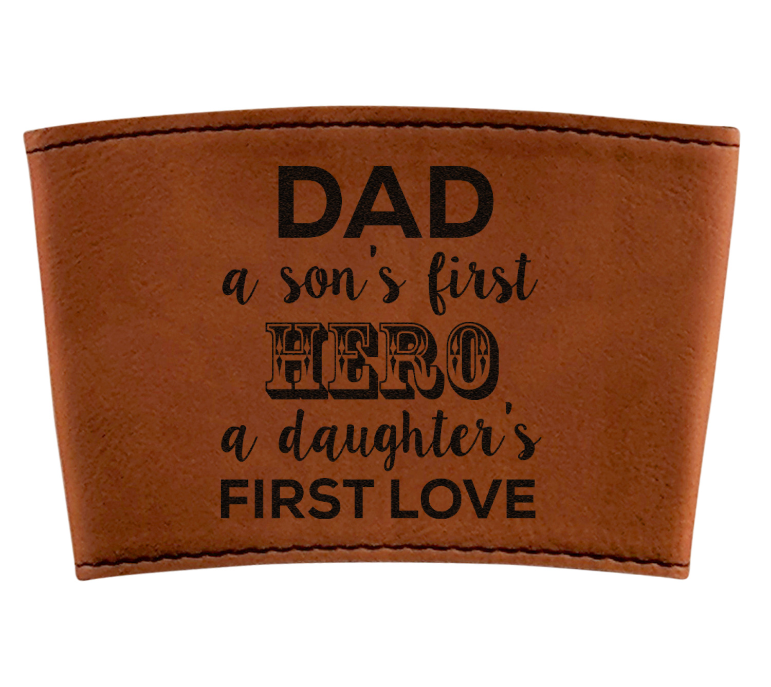 This cup sleeve is made from a suave, cognac-brown leatherette and finished with an intricate, black stitch. The interior of this can sleeve is fabricated from a thin foam material to help insulate your mug's contents. The sleeve is specifically made to suit tapered glasses or mugs, so the top's diameter is 3.5 inches, while the bottom's diameter is 2.75 inches. Your customized design will be laser engraved into the leatherette, leaving behind crisp, black imprint. With these products, we provide you with the option of engraving the front and back, or the front only.