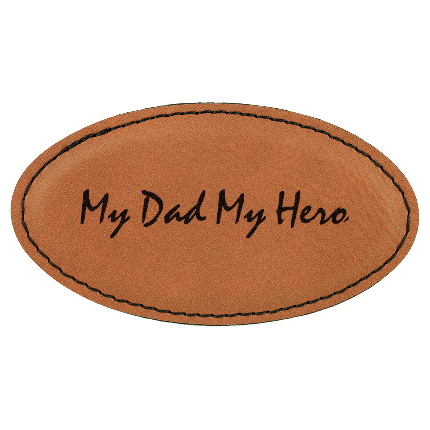 Made from a cognac-brown leatherette into an oval shape, these custom name badges measure at around 3.25" x 1.75". To add the suave appearance of this custom badge, a fine black stitching lines the edges or the badge itself. Your customized design is laser-engraved onto the surface of the leatherette. Accompanying your purchase is a removable magnet strip that can be used to secure the engraved name tag to any shirt, dress, or jacket.