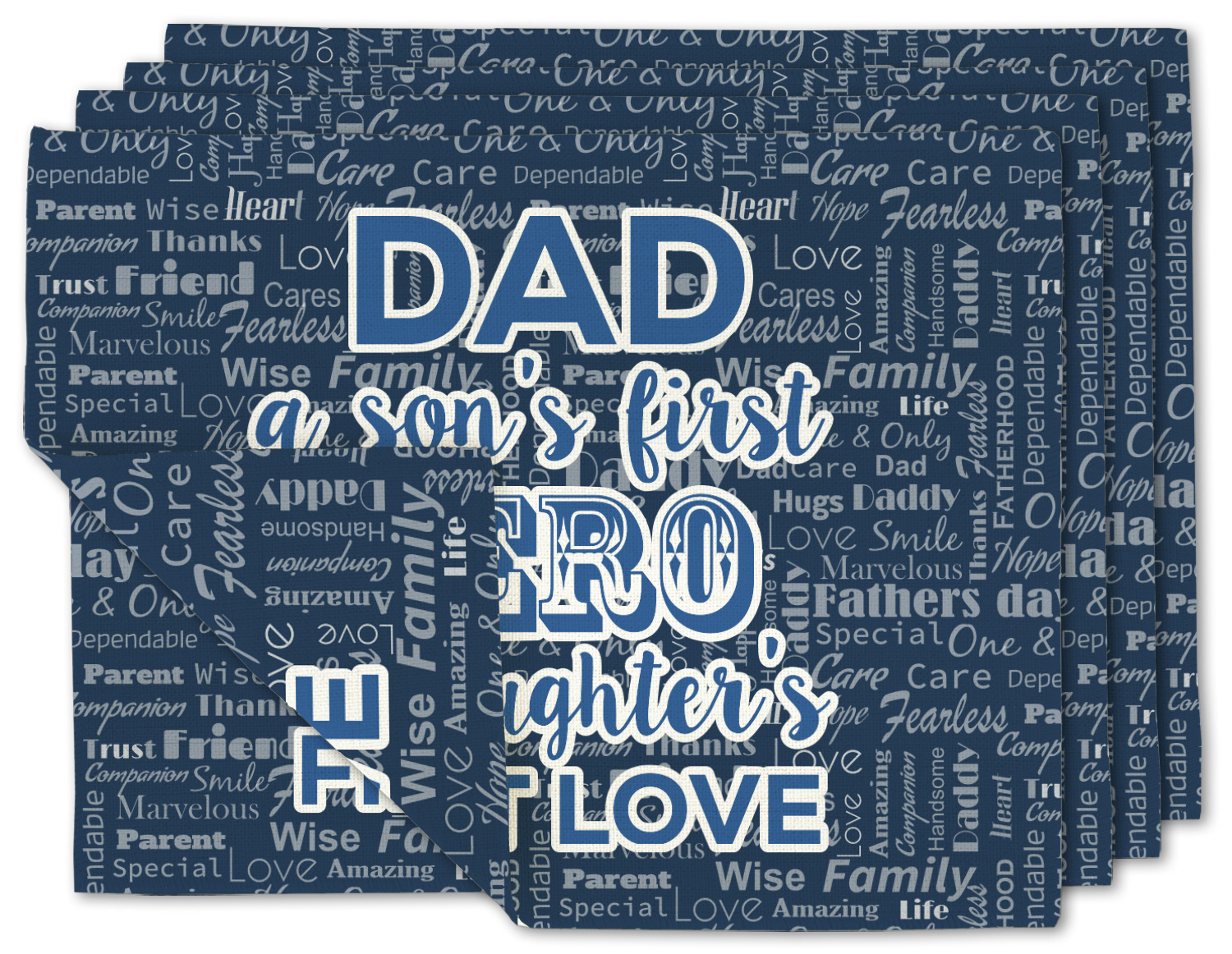The background of this design is a fun word cloud that says different words to describe a father like "friend," "thanks," "father's day," "happiness," and more. The design is filled with a few different shades of blue and a little accent of white. The main graphic is a quote that says "Dad, a son's first hero, a daughter's first love." What a sweet design for Father's Day!