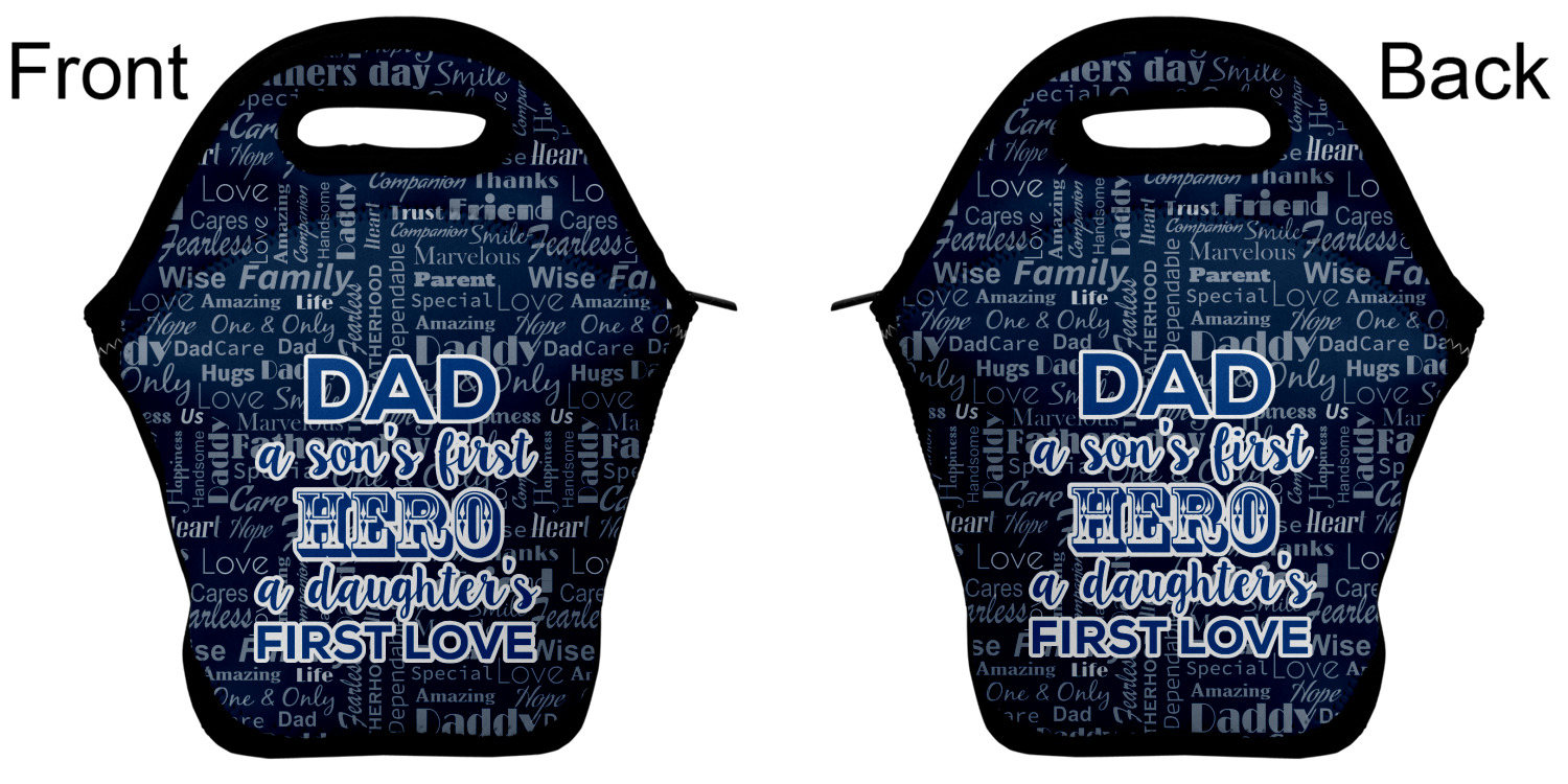 Our personalized lunch bags are made from a strong neoprene, and secure with a zipper closure that lines the top of the bag.The edges of the neoprene are sewn together with a heavy duty stitch, adding to the durability of the bag. The is accompanied by a reinforced handle at its top, for the easy transport of your lunch. We display your personalization across both the front and back of this neoprene lunch bag, while the remaining sides are a sleek black in color. Each bag measures at 13.5 inches tall, and 11.5 inches wide.